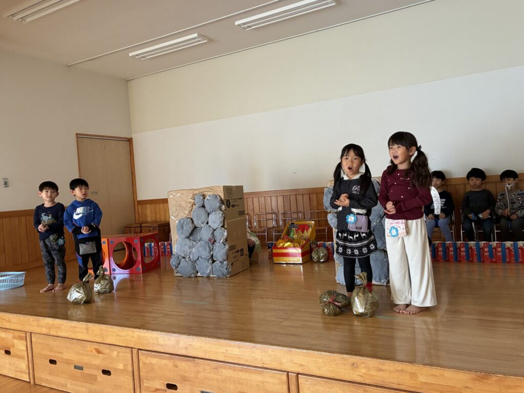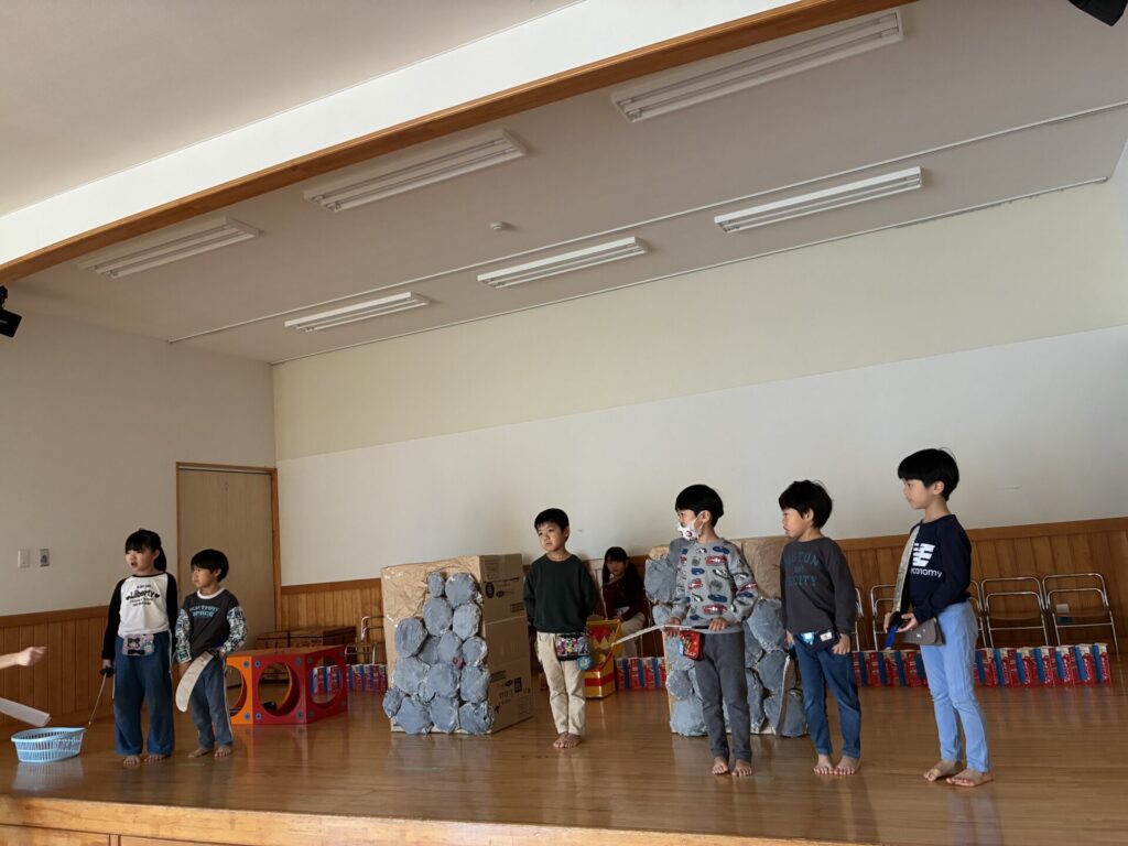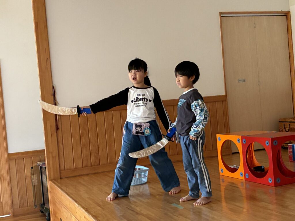 劇の練習を主に行っています。アリババの劇は、子ども達も気に入ってくれていて、身振り手振りも付けながら張り切って取り組んでくれていますよ⚔