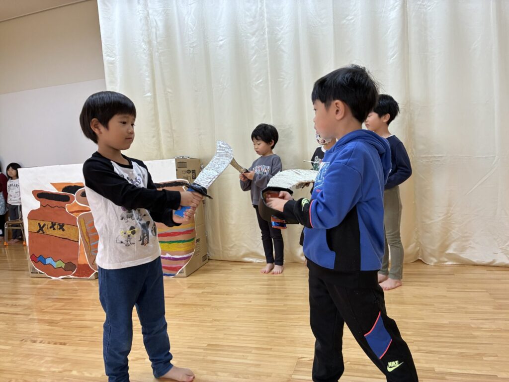 戦いのシーンはちょっぴり難しいようですが、「えい!やー!!!」と大きな声をだして練習していますよ💪