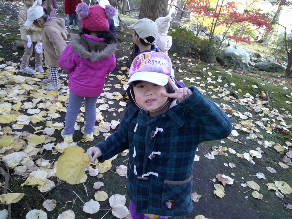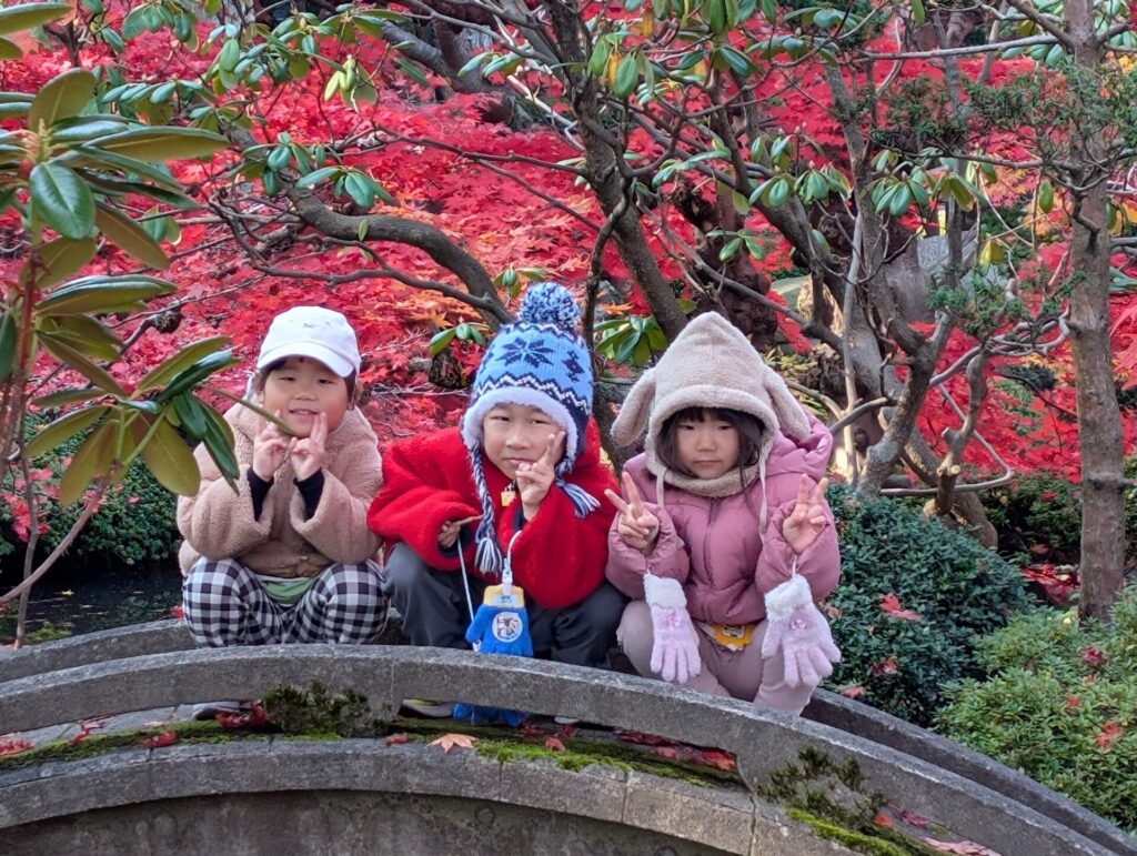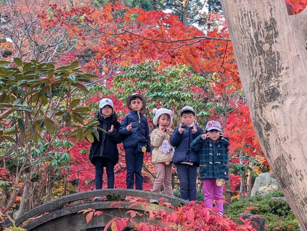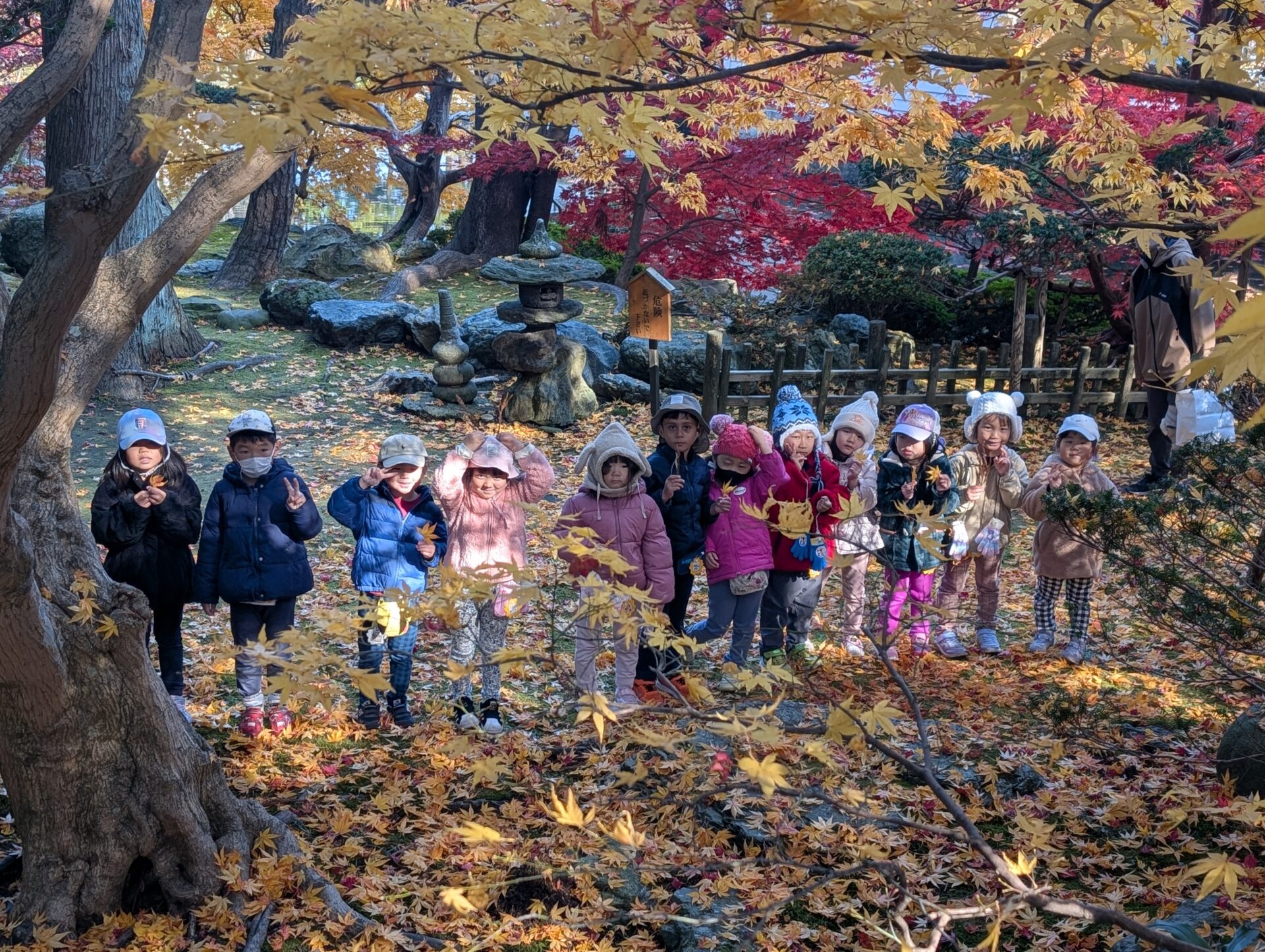 梅村庭園にお散歩へ行きました🚶紅葉がとっても綺麗で、素敵な落ち葉を沢山拾ってきましたよ。木から葉っぱが揺れるのを見て、「桜みたいだね~」と楽しんでいました。大きい葉っぱも見つけ「これいいね!」と大満足でしたよ🍂拾ってきた葉っぱを画用紙に貼り、飾ったので1階の廊下を見てみて下さいね😌