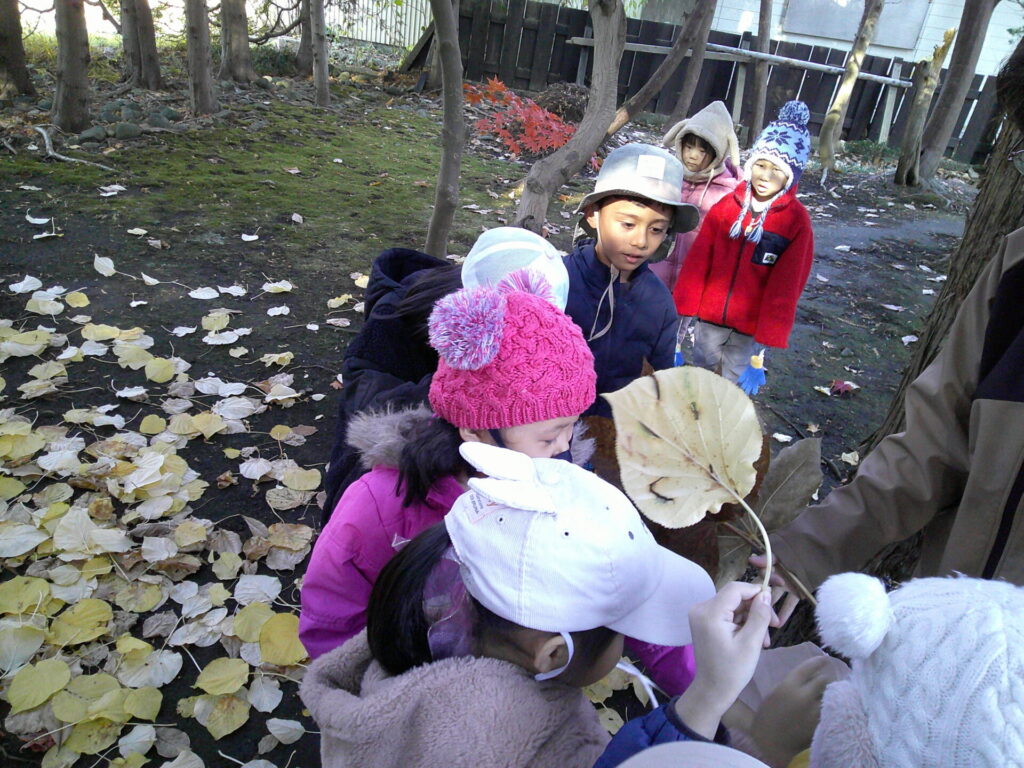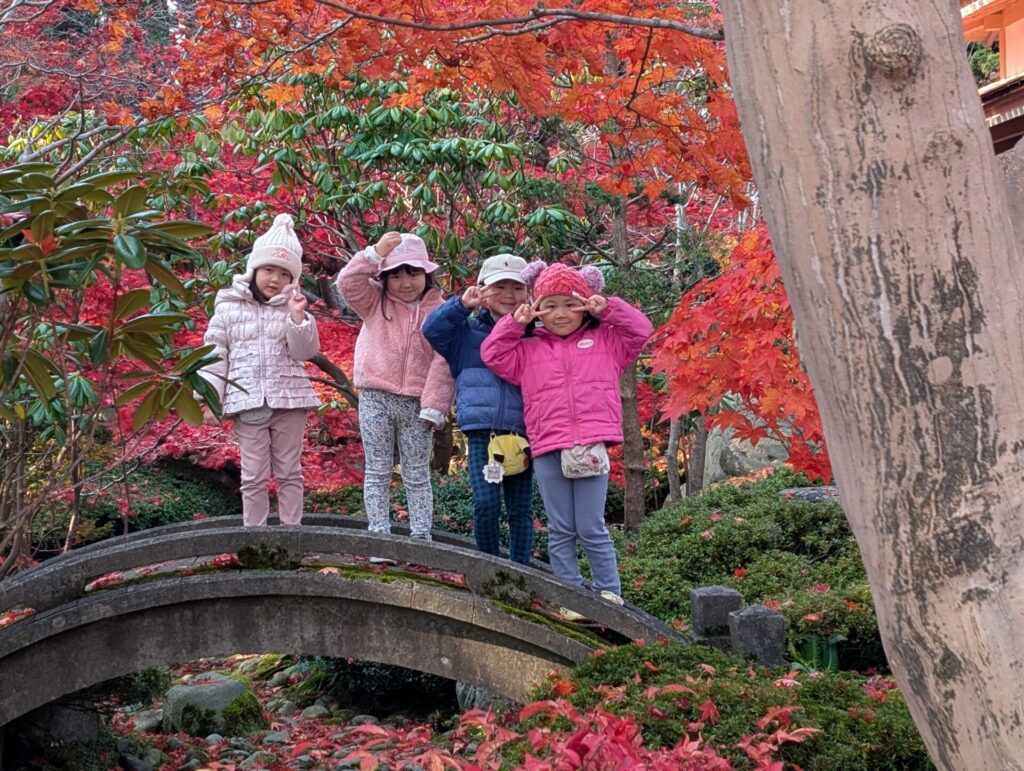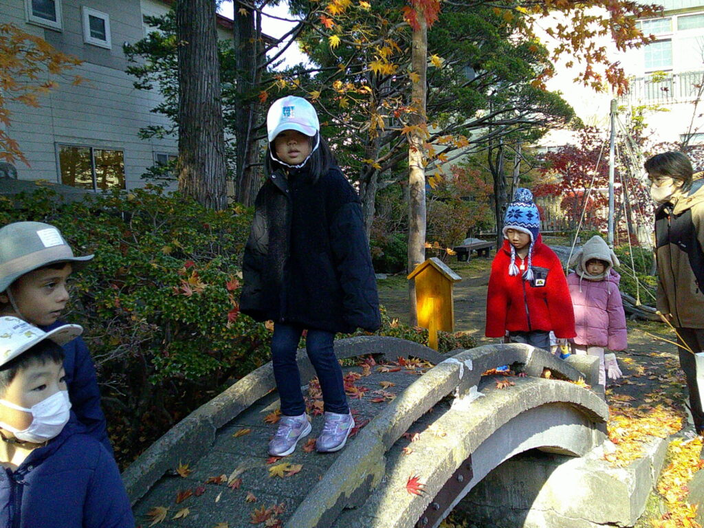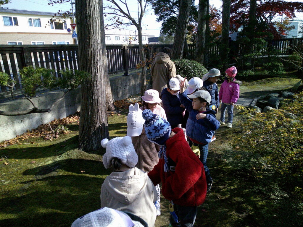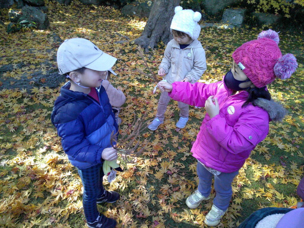 梅村庭園にお散歩へ行きました🚶紅葉がとっても綺麗で、素敵な落ち葉を沢山拾ってきましたよ。木から葉っぱが揺れるのを見て、「桜みたいだね~」と楽しんでいました。大きい葉っぱも見つけ「これいいね!」と大満足でしたよ🍂拾ってきた葉っぱを画用紙に貼り、飾ったので1階の廊下を見てみて下さいね😌