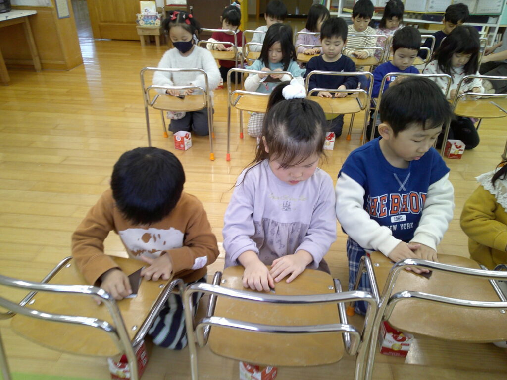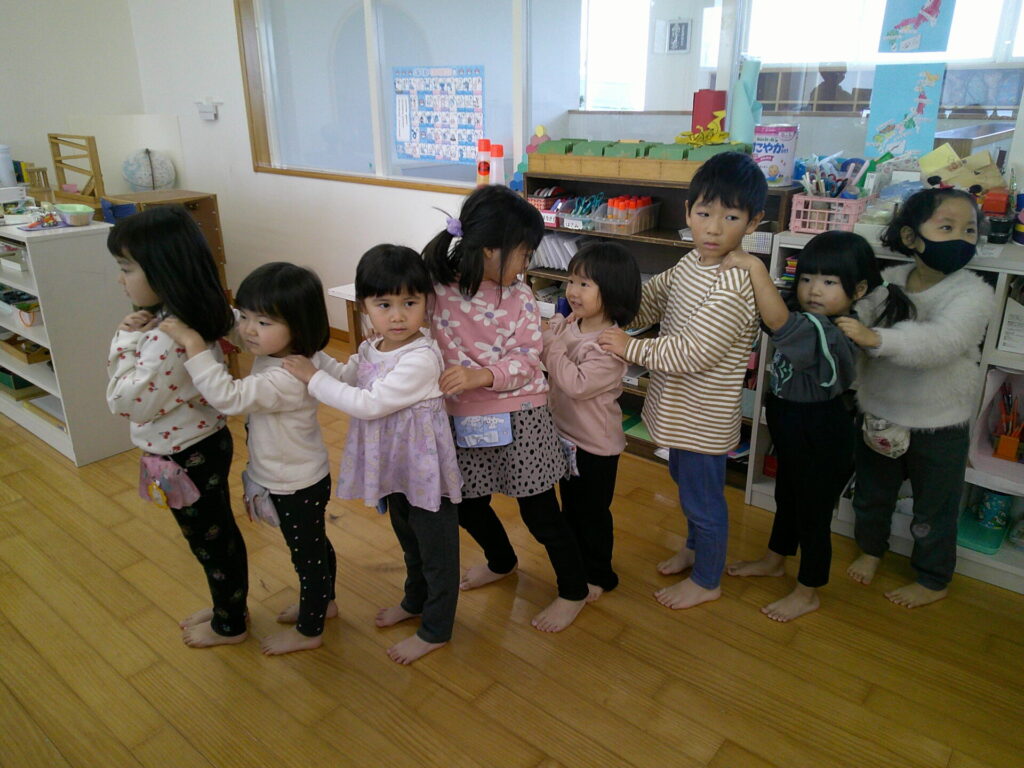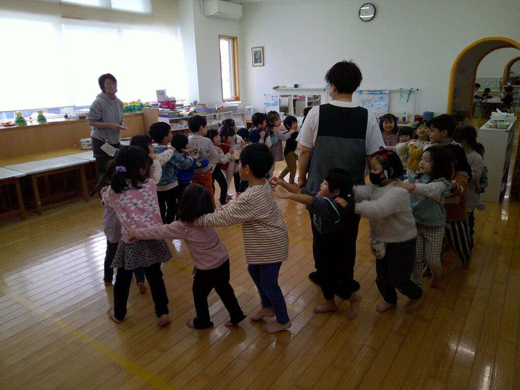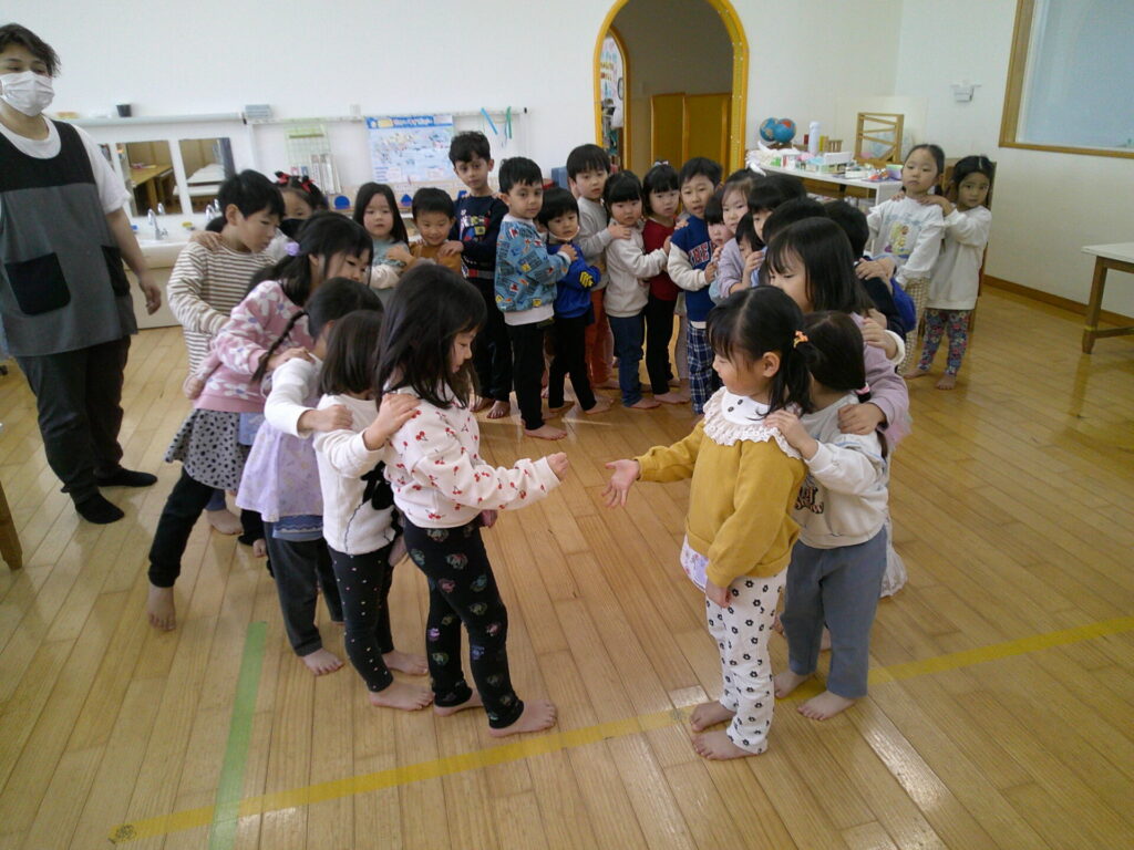 赤バッチさんと一緒にじゃんけん列車をしました🚂ピアノに合わせながらじゃんけんするお友達を見つけて、楽しみましたよ。ルールをしっかりと理解していた子ども達でした😊