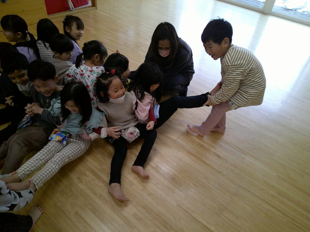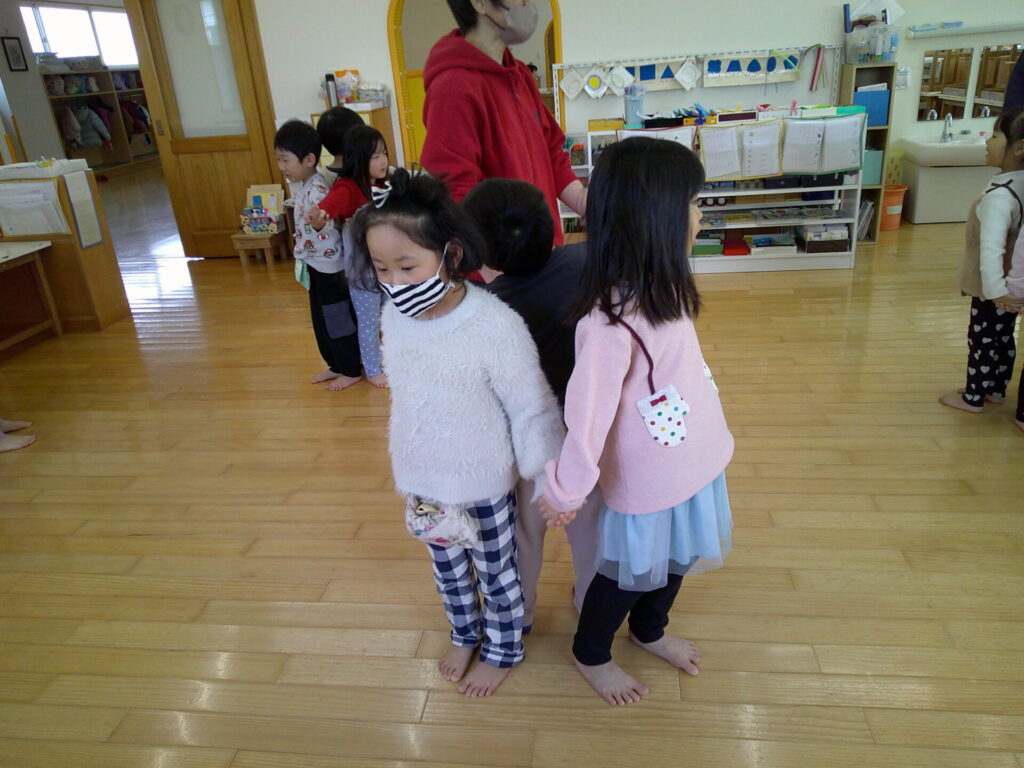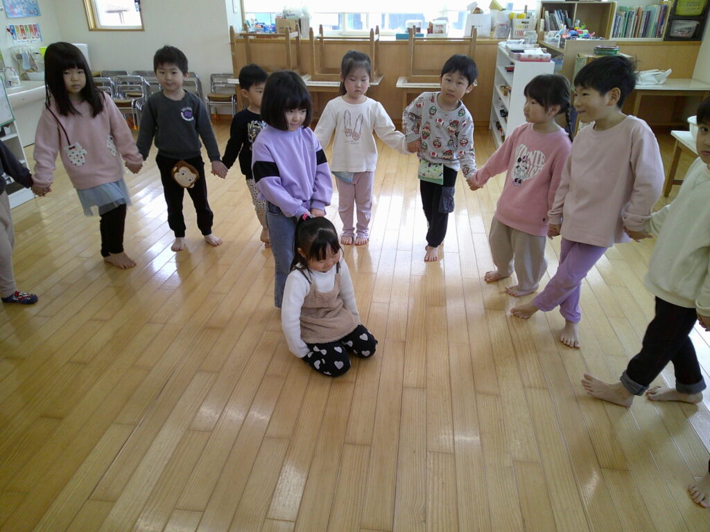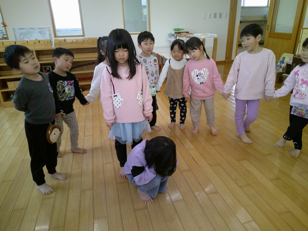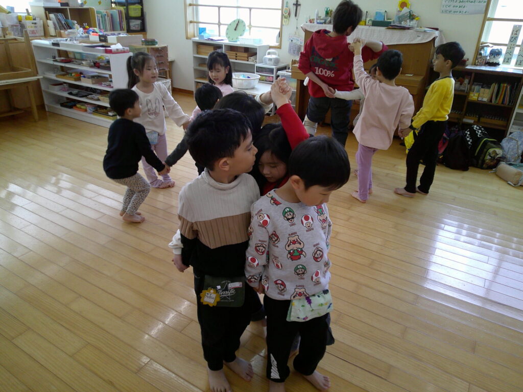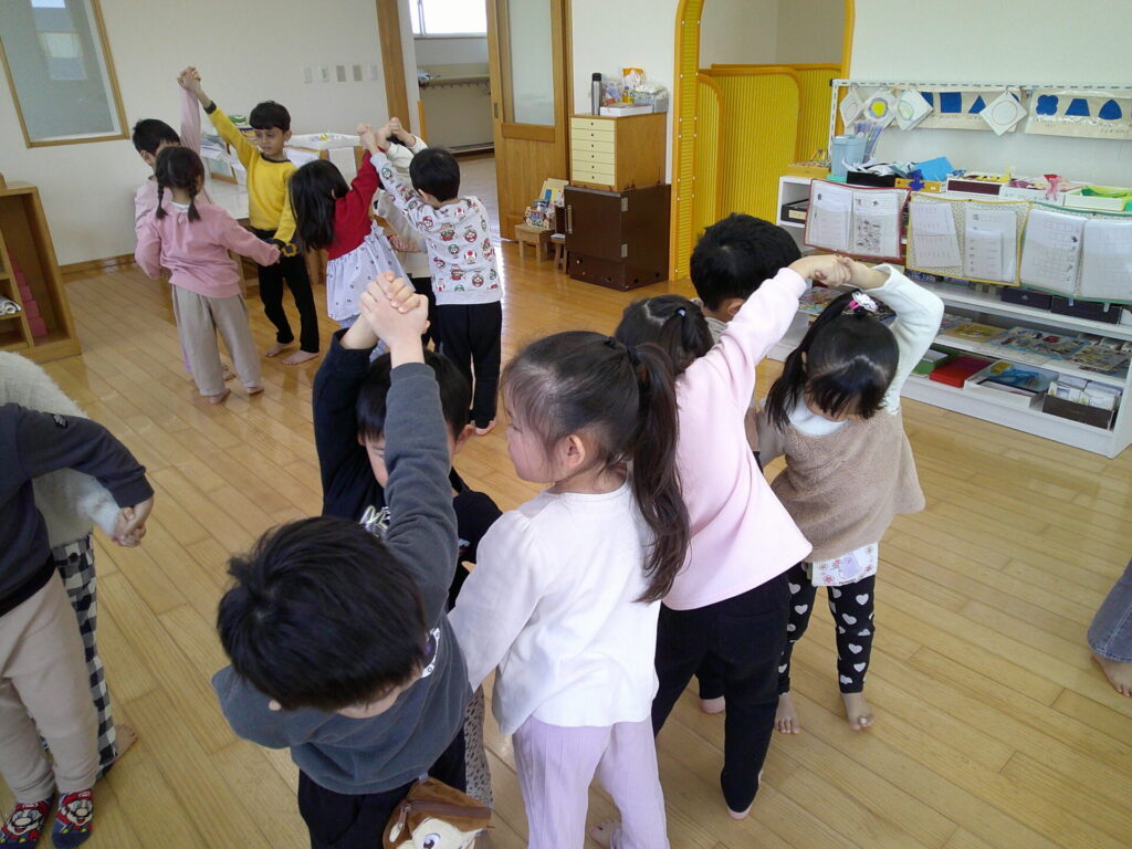 「なべなべそこぬけ」をしました。ルールを確認しながらチャレンジしましたよ💪人数が増えてくるとどうやってひっくりかえるのかが分からず苦戦していましたが、慣れてくるとスムーズに入ることが出来ていました。最後には全員でひっくりかえることが出来、バッチリでした✨