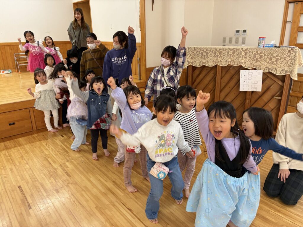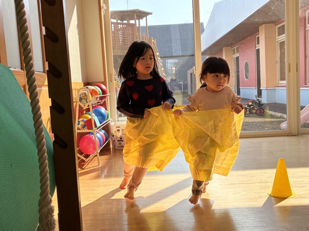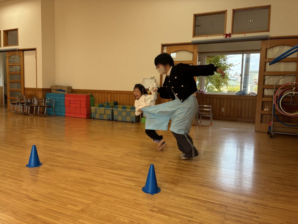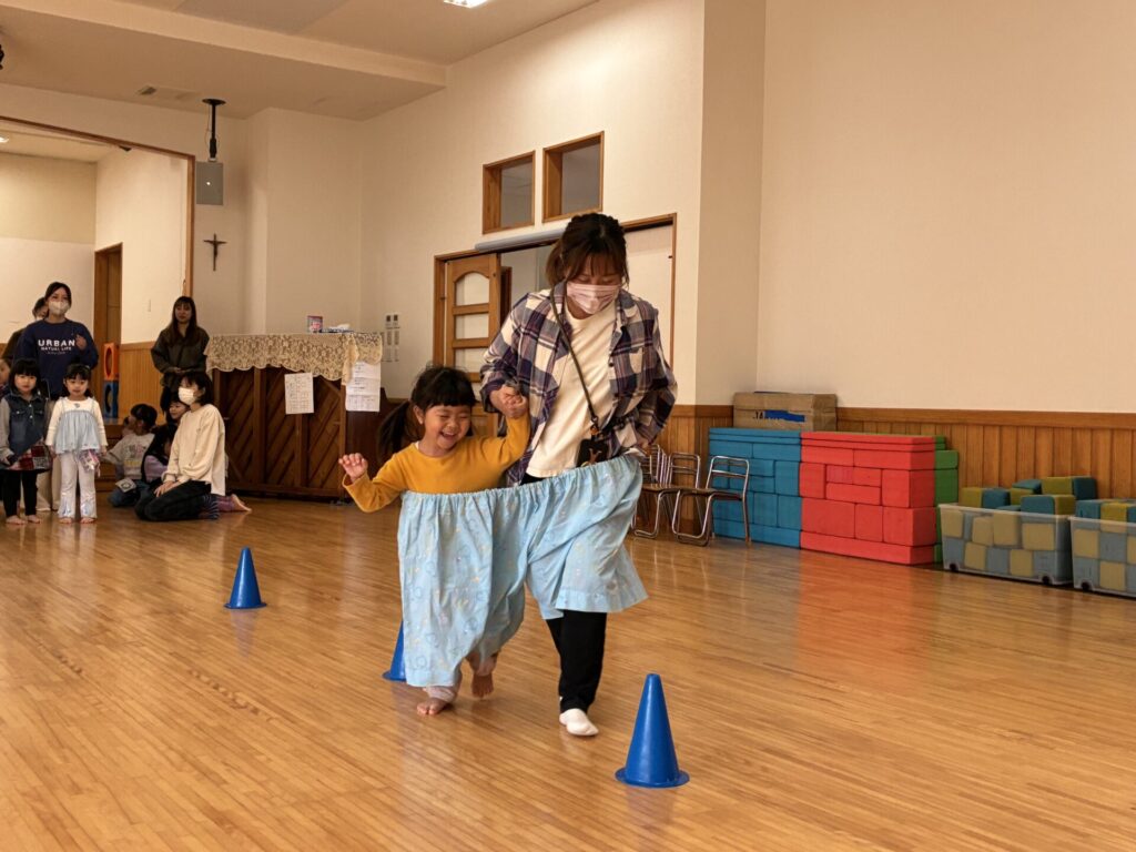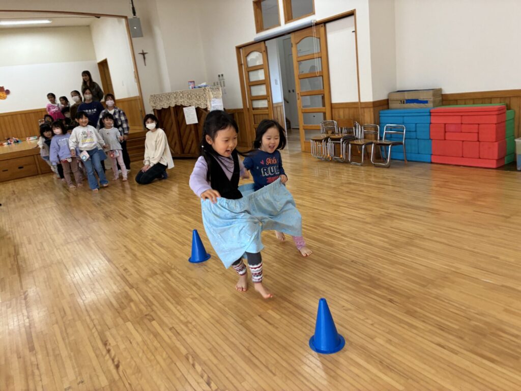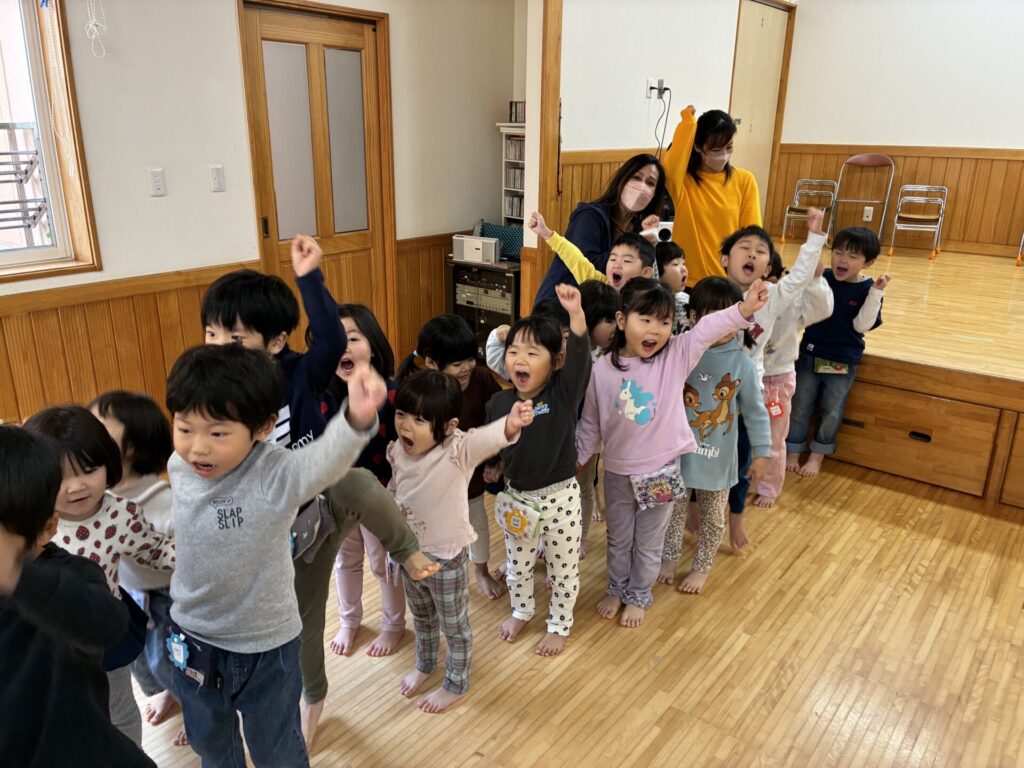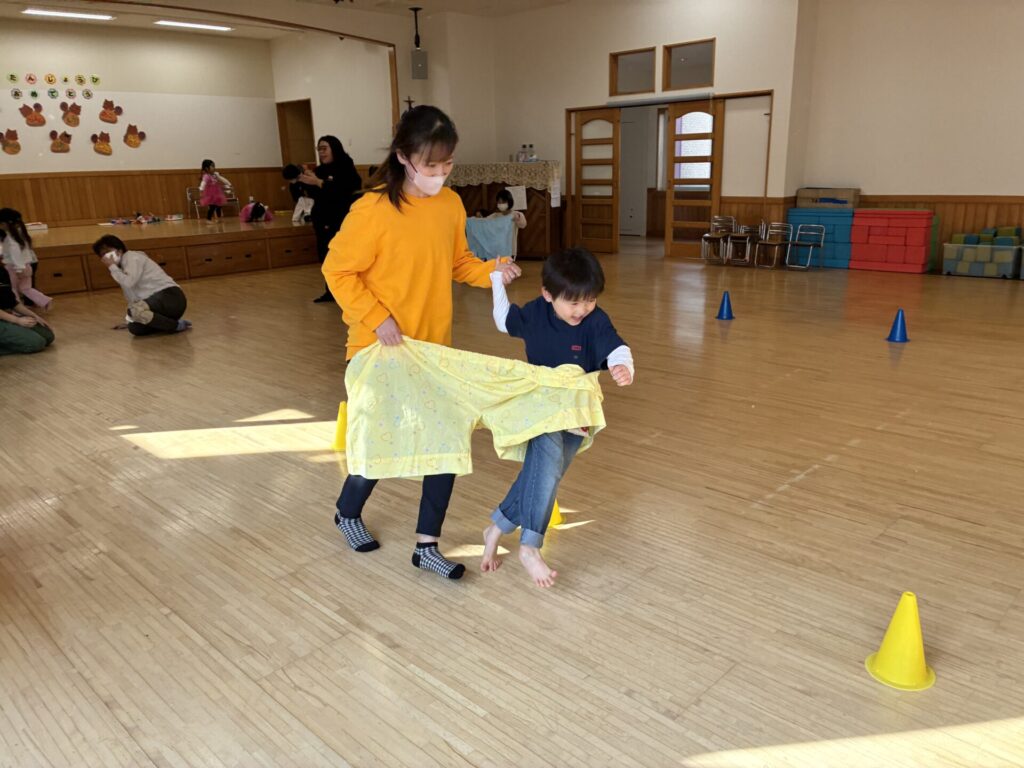次は楽しみにしていたゲームの時間!デカパン競争をしたりじゃんけん列車をしたり、ジャンプリレーをしたり、今回は3つもゲームをしました!青チームと黄色チームに分れて勝負し、引き分けに終わりました!!ジャンケン列車は大盛り上がり! どのゲームも全力で楽しんでいた子ども達でした🔥