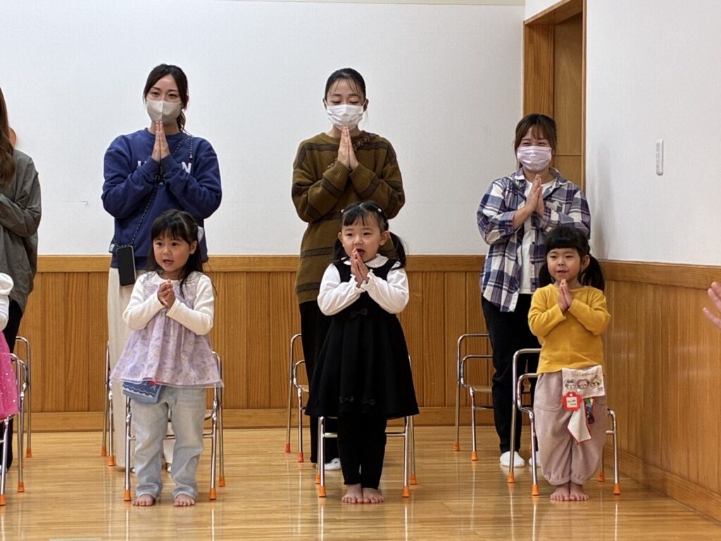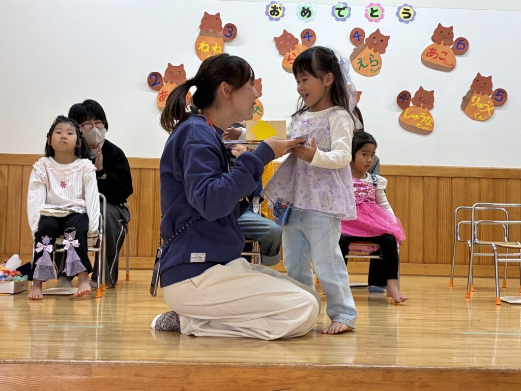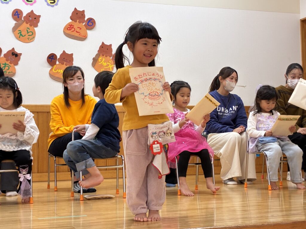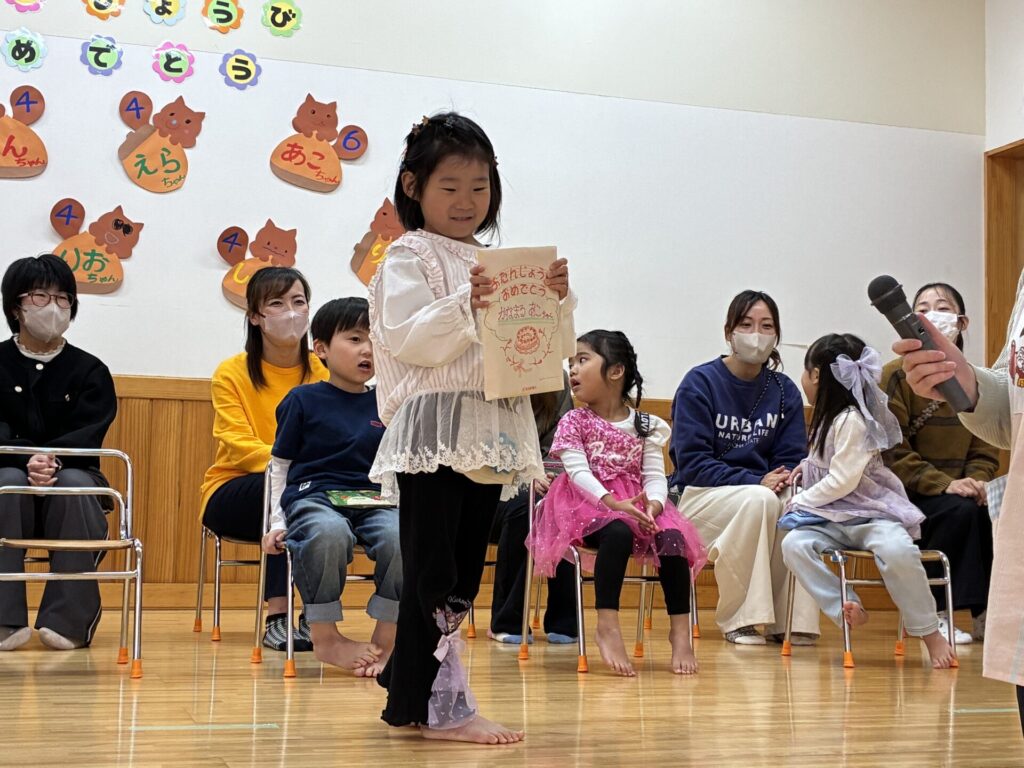 入場し、全員でお祈りした後は園からプレゼントです!お誕生の本には、みんなの好きな遊びや身長・体重が書かれ、みんなの可愛い写真が貼ってありますよ!子ども達とお家でゆっくり見て見て下さい💓