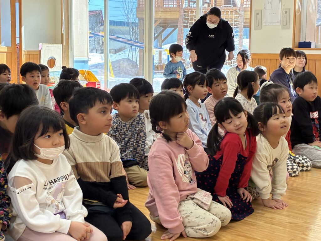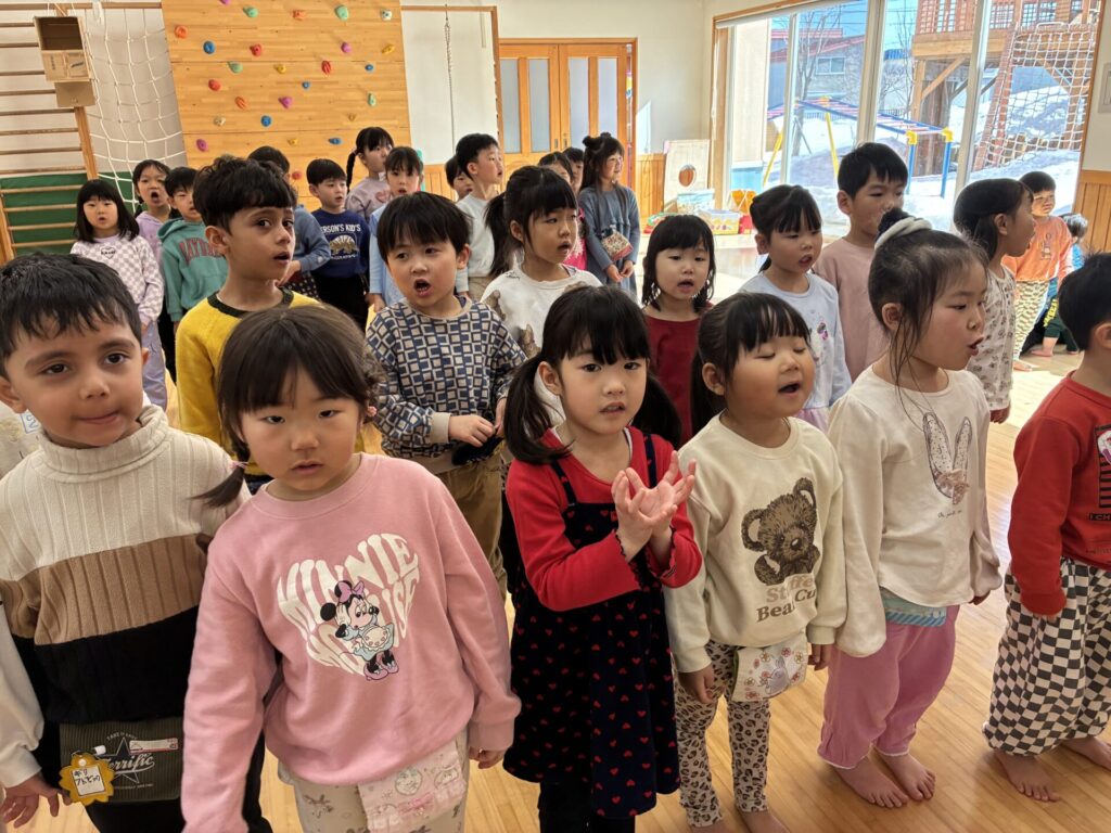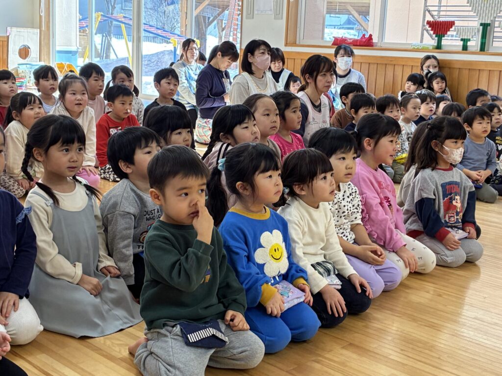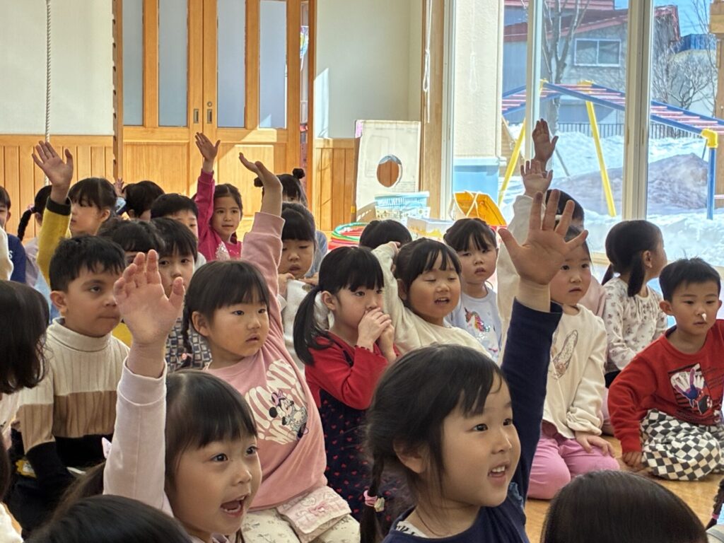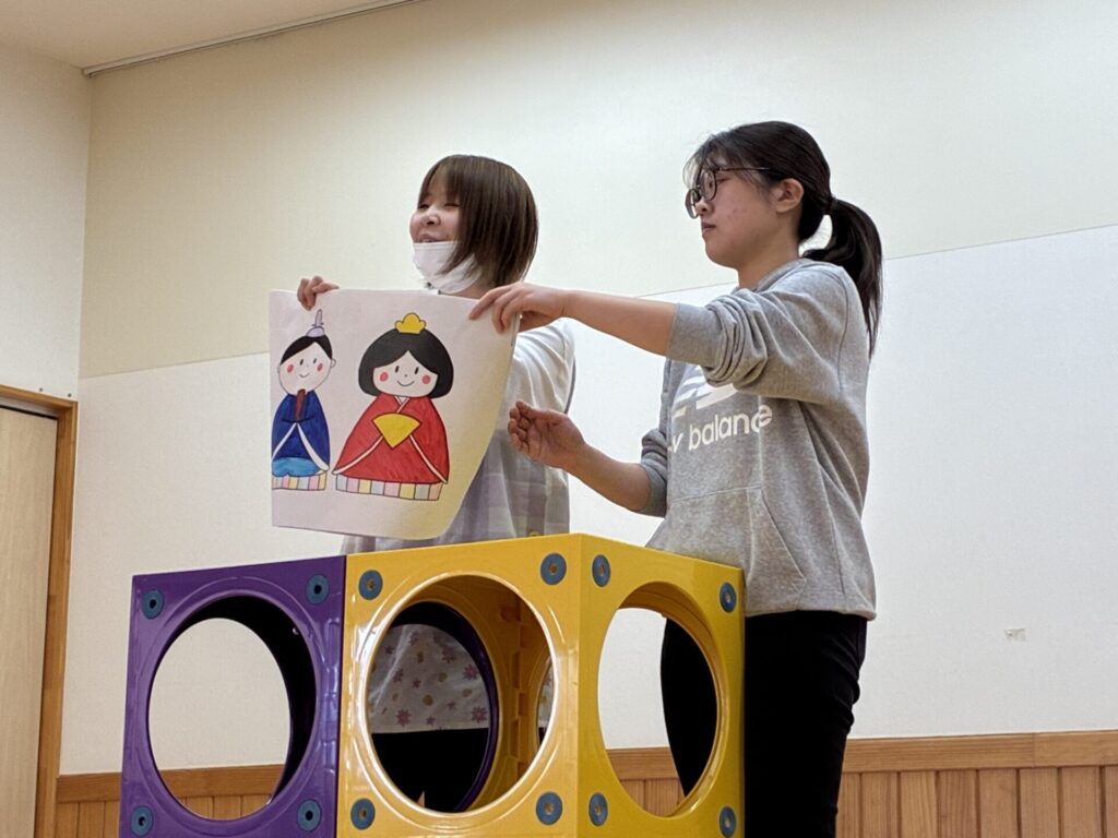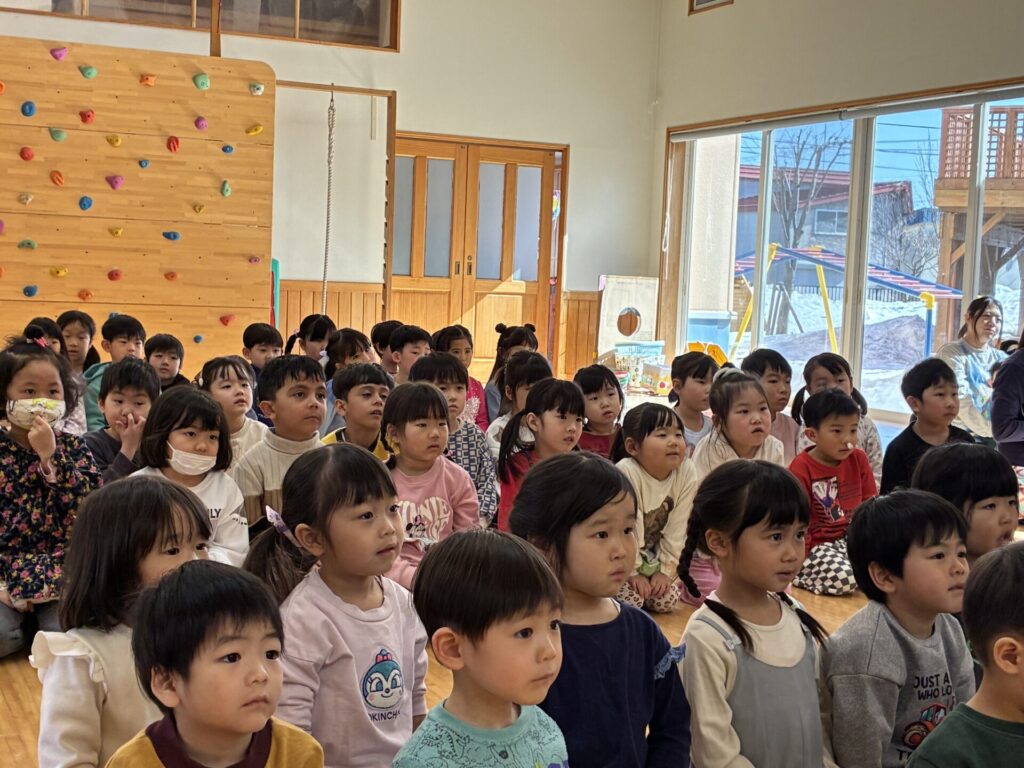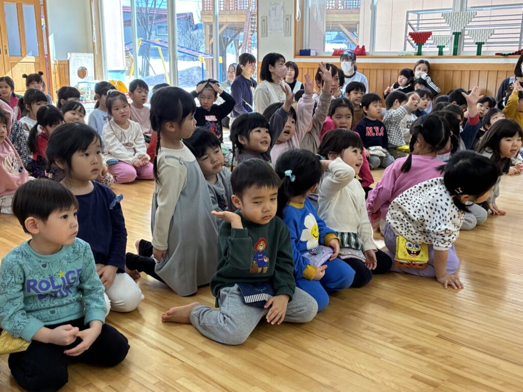 今日は「ひな祭り」でした🎎由来を手作り紙芝居で見ていた子ども達です。とっても集中して見ていましたよ。その後はクイズをしました。手作り紙芝居の中からクイズを出題しましたが、よく聞いてクイズに答えていました。とってもノリノリでしたよ☺️