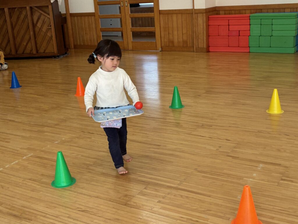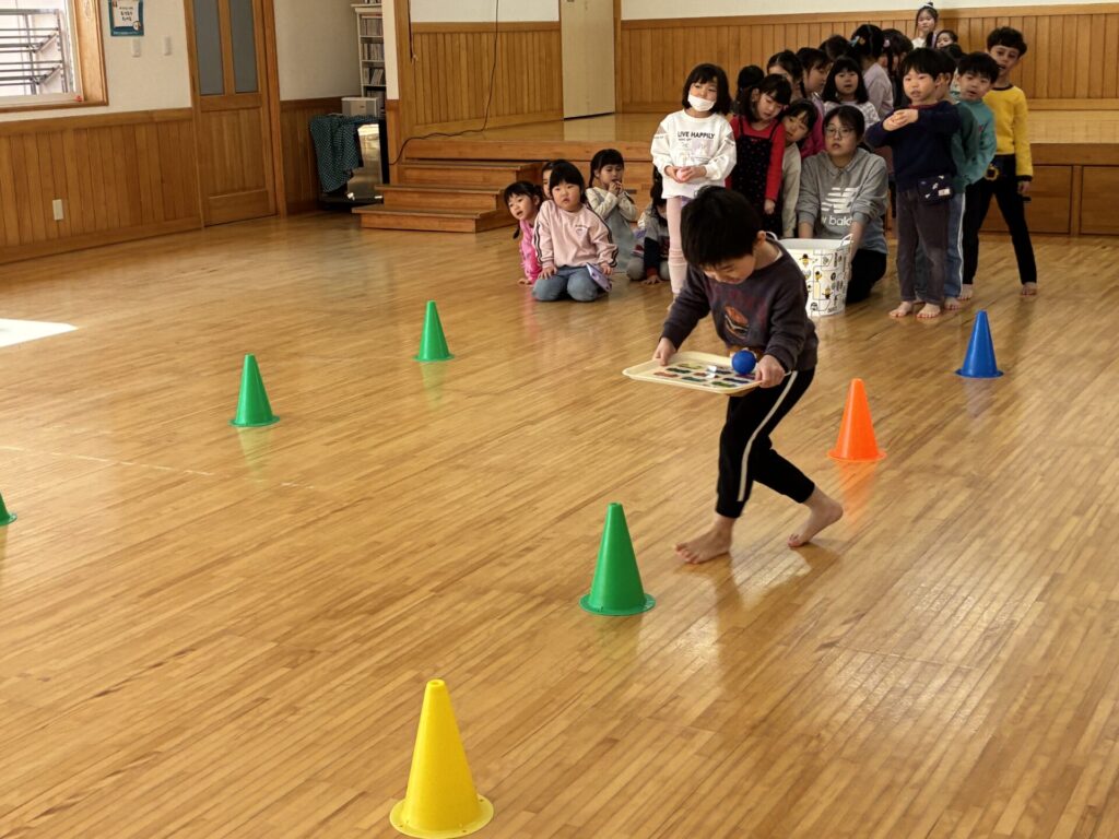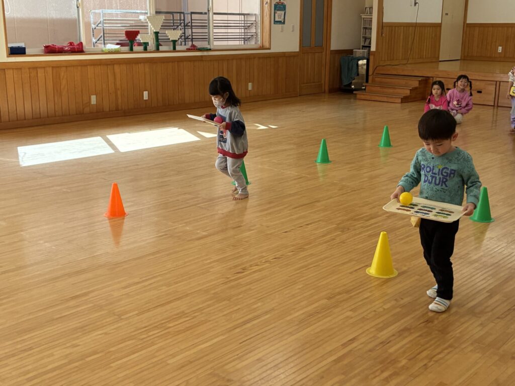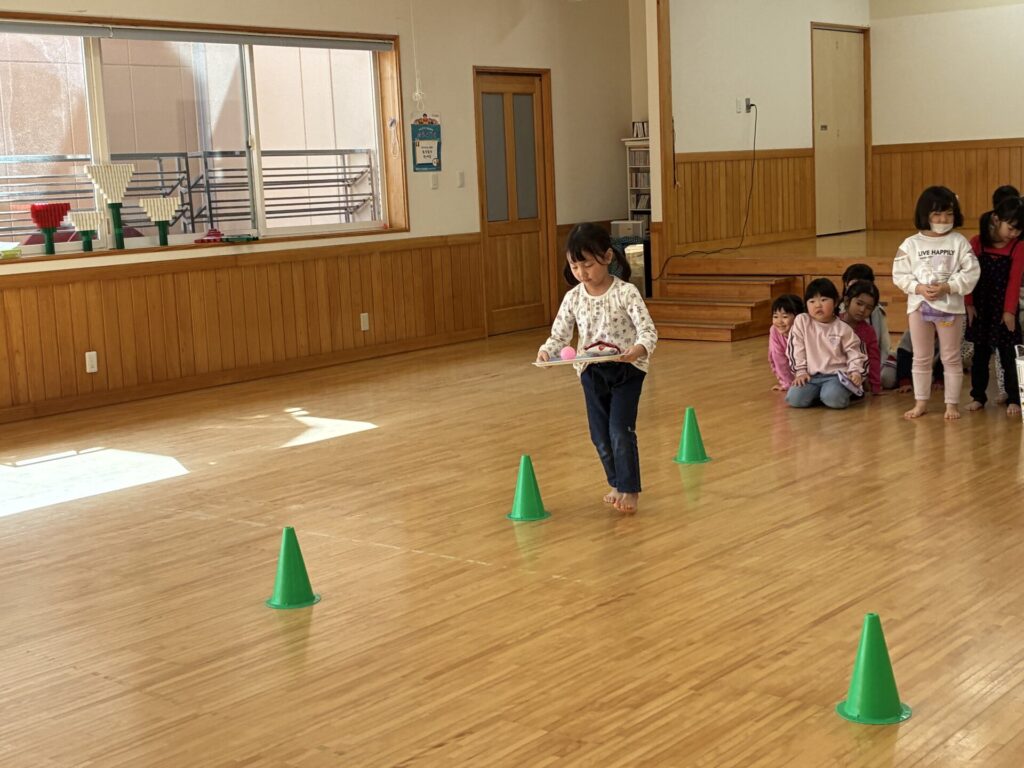 その後はゲームをしました😊ボールをお盆に乗せ、お雛様とお内裏様の所まで持って行くというルールで行いました。お盆からボールを落とさないよう頑張っていた子ども達です😄女の子対男の子で競争し、応援にも熱が沢山入っていました。負けないよう必死な姿が可愛らしかったです💓