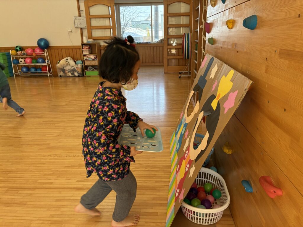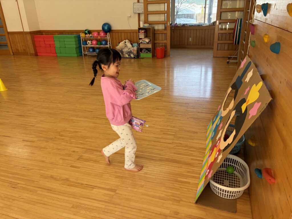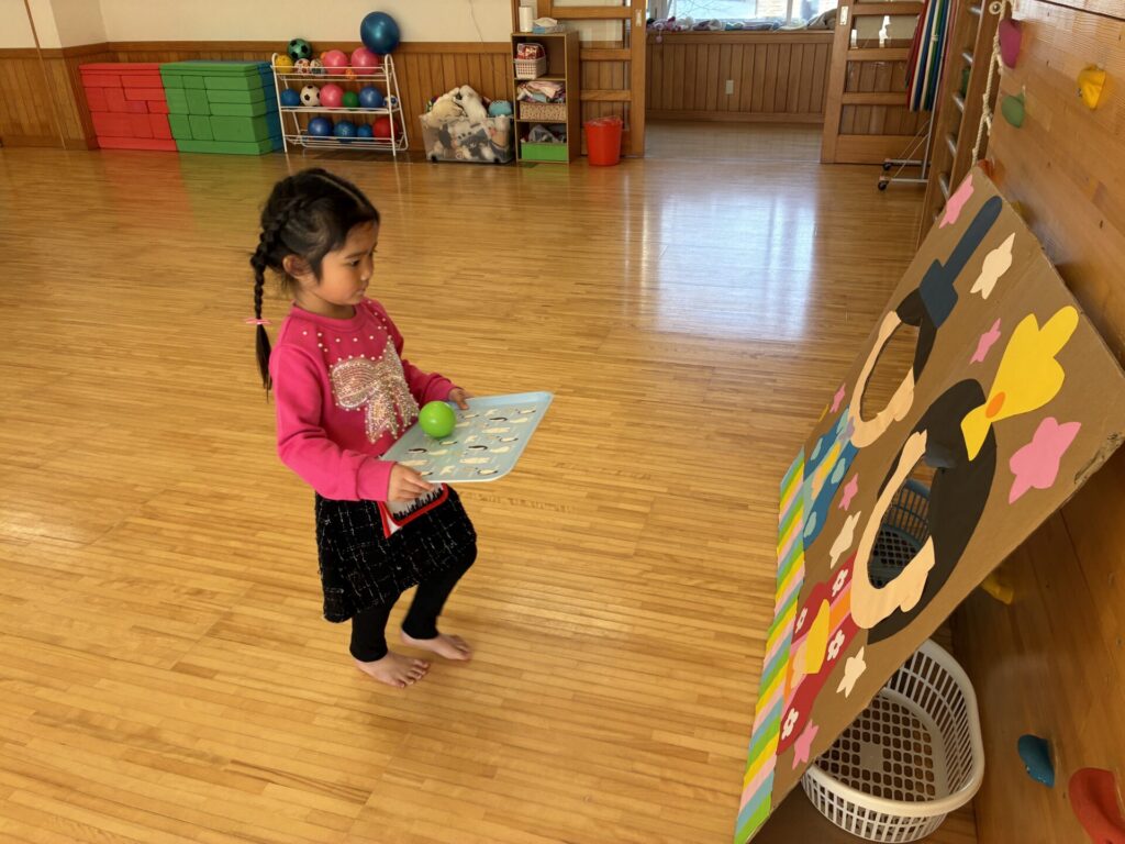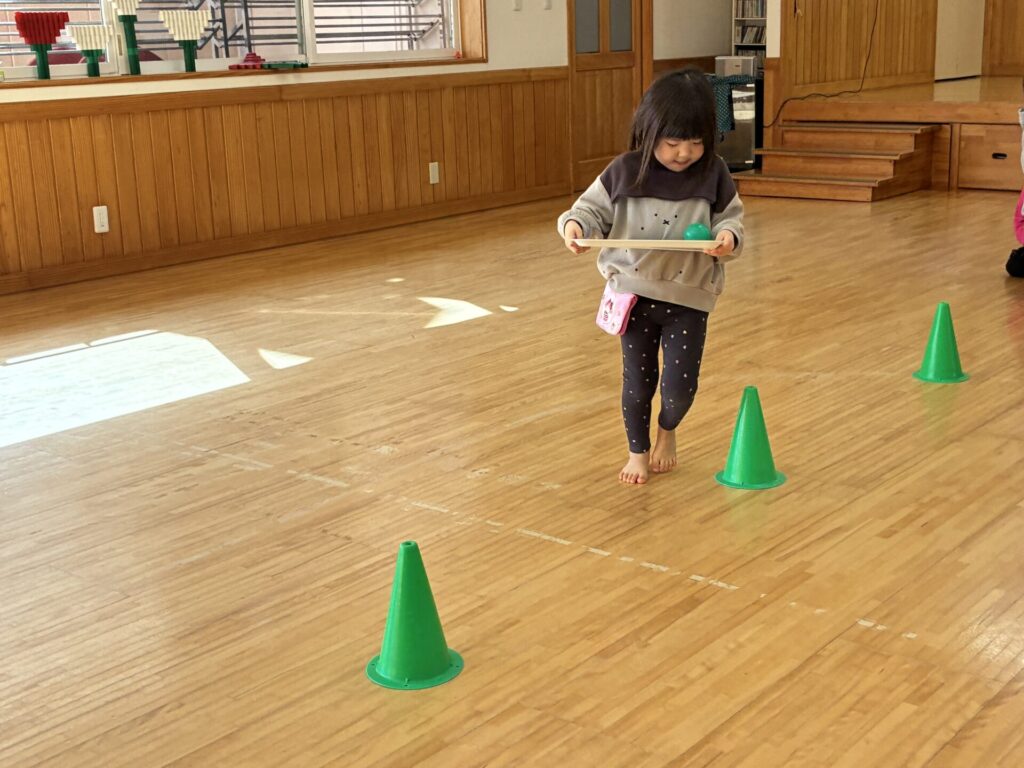 その後はゲームをしました😊ボールをお盆に乗せ、お雛様とお内裏様の所まで持って行くというルールで行いました。お盆からボールを落とさないよう頑張っていた子ども達です😄女の子対男の子で競争し、応援にも熱が沢山入っていました。負けないよう必死な姿が可愛らしかったです💓