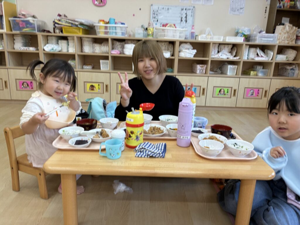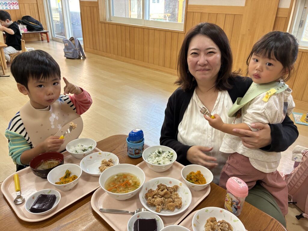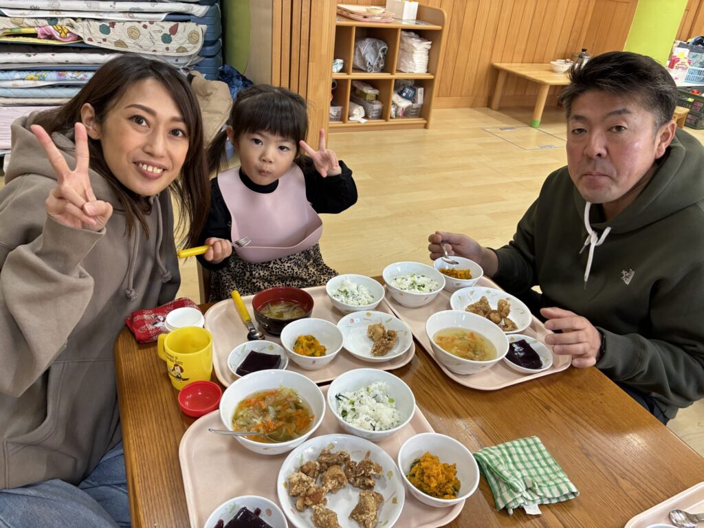 おかあさん、お父さんと一緒に食べる給食は、特別で美味しかったね😋たくさん食べて、明日も元気に来てくださいね😊