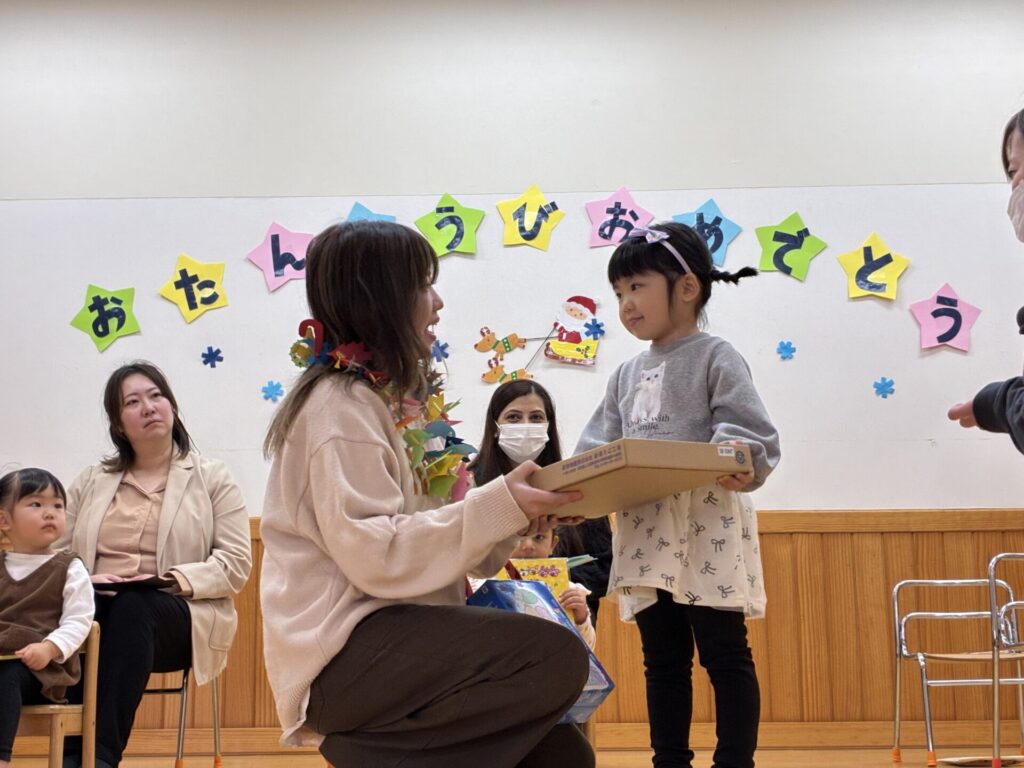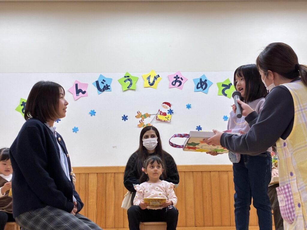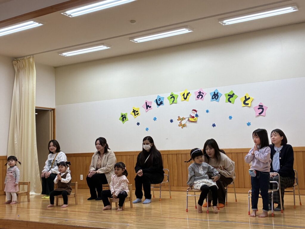 今日は12月のお誕生会でした。以上児さんは2名のお友達が参加してくれました。お母さんと一緒に入場し、照れくさそうにしつつも嬉しそうでした😊