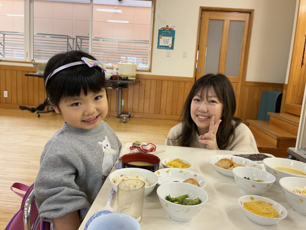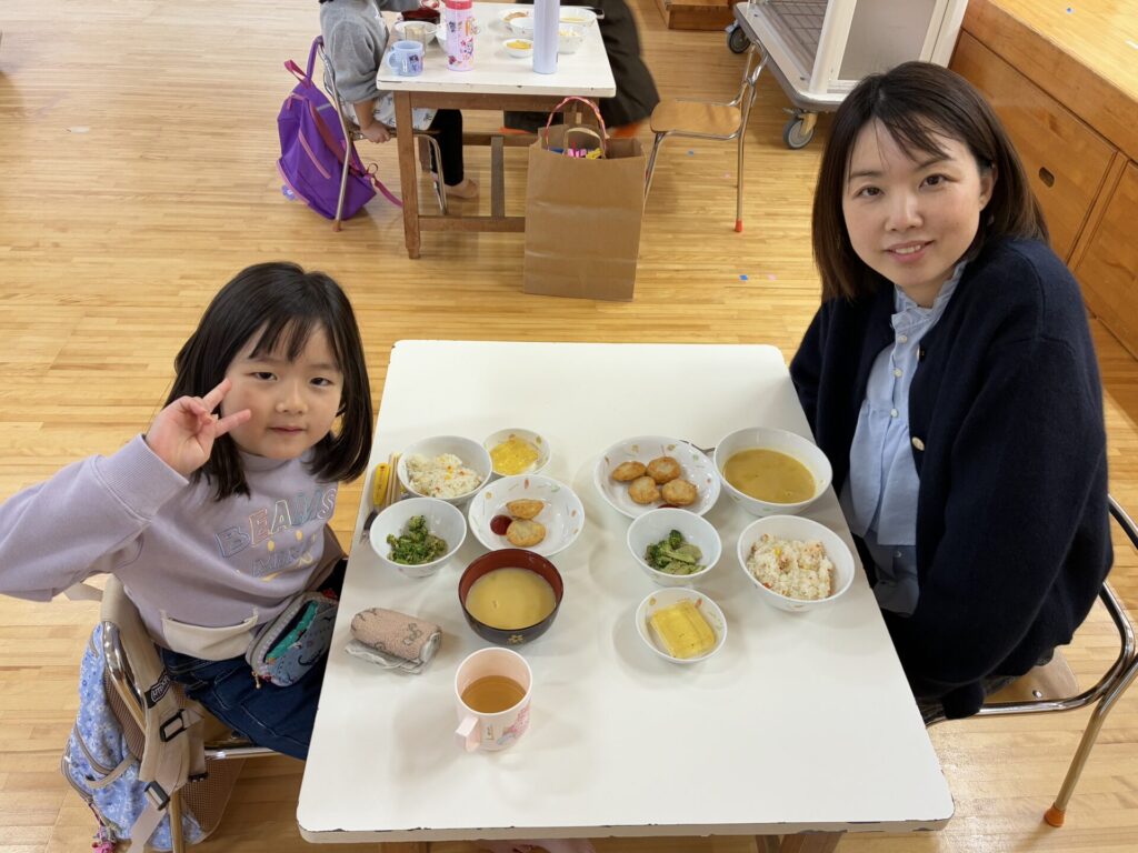お母さんと一緒の給食に時間。楽しそうにお話ししながらの食事はとてもほほえましかったです💓