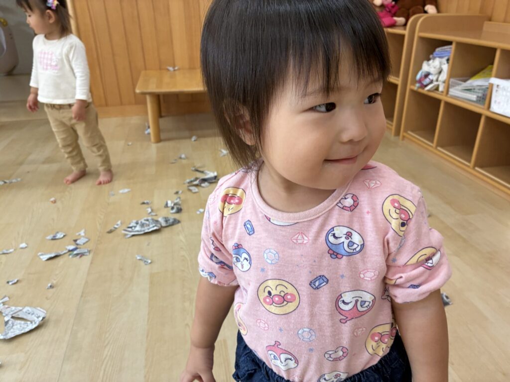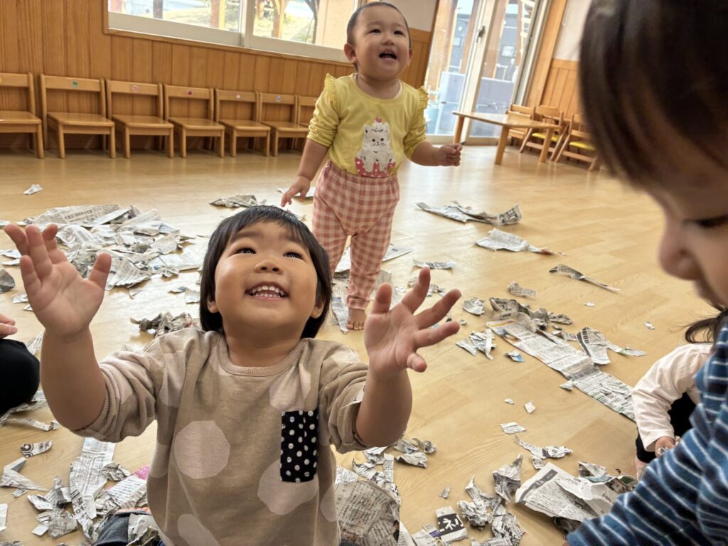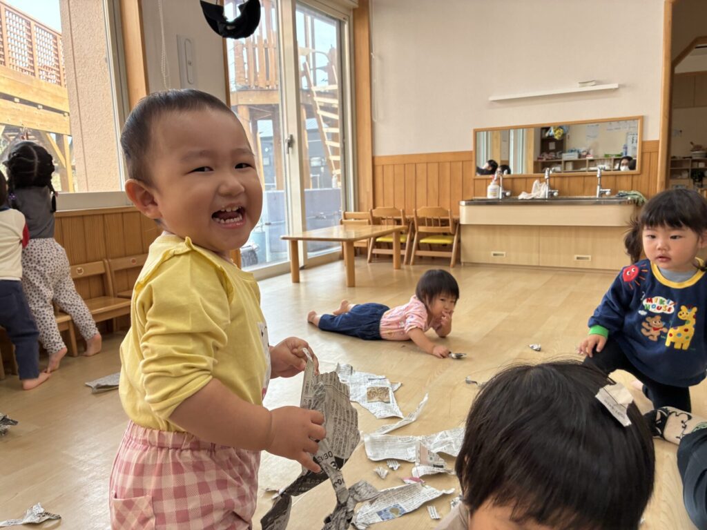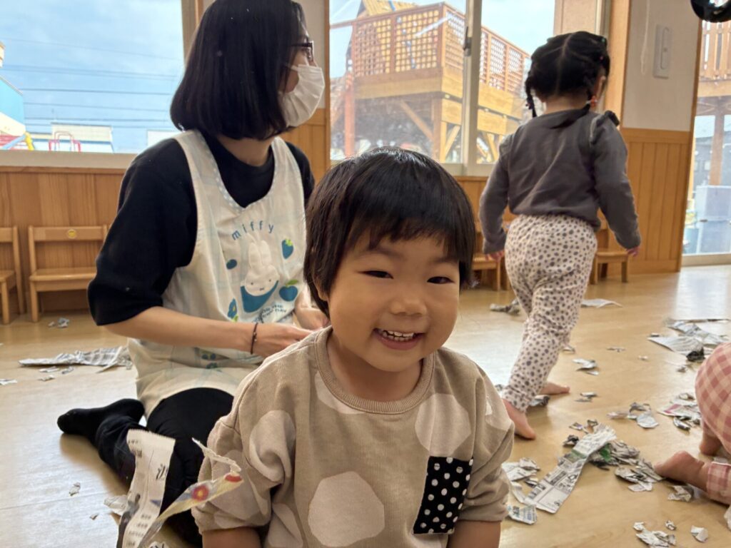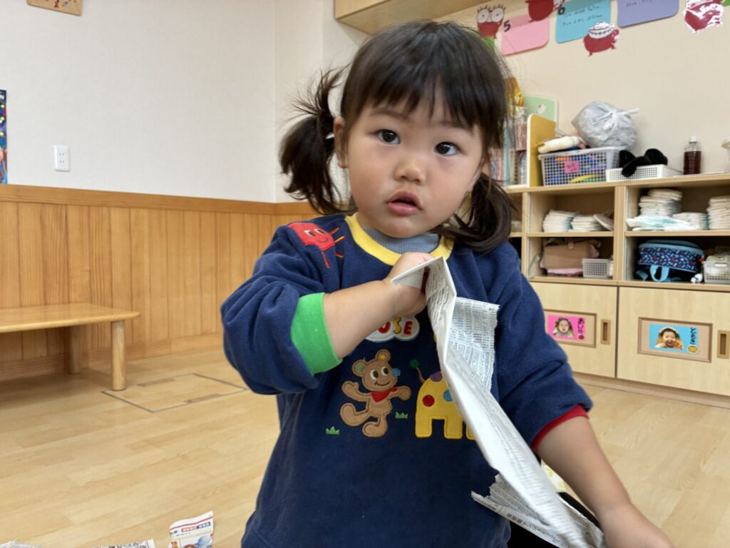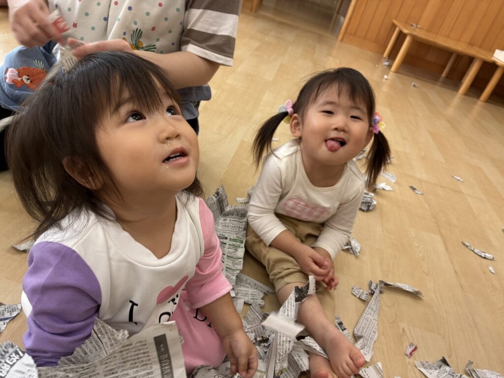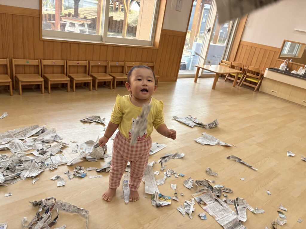 その後はお部屋で新聞遊びをしましたよ😊上から新聞を降らせると「きゃー!!」と大きな声を出して喜んでいてとても可愛らしかったです💕