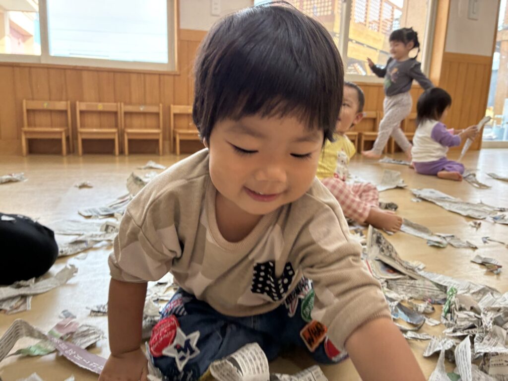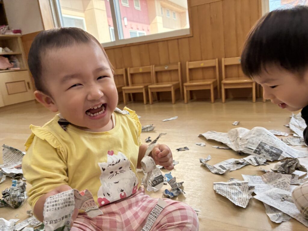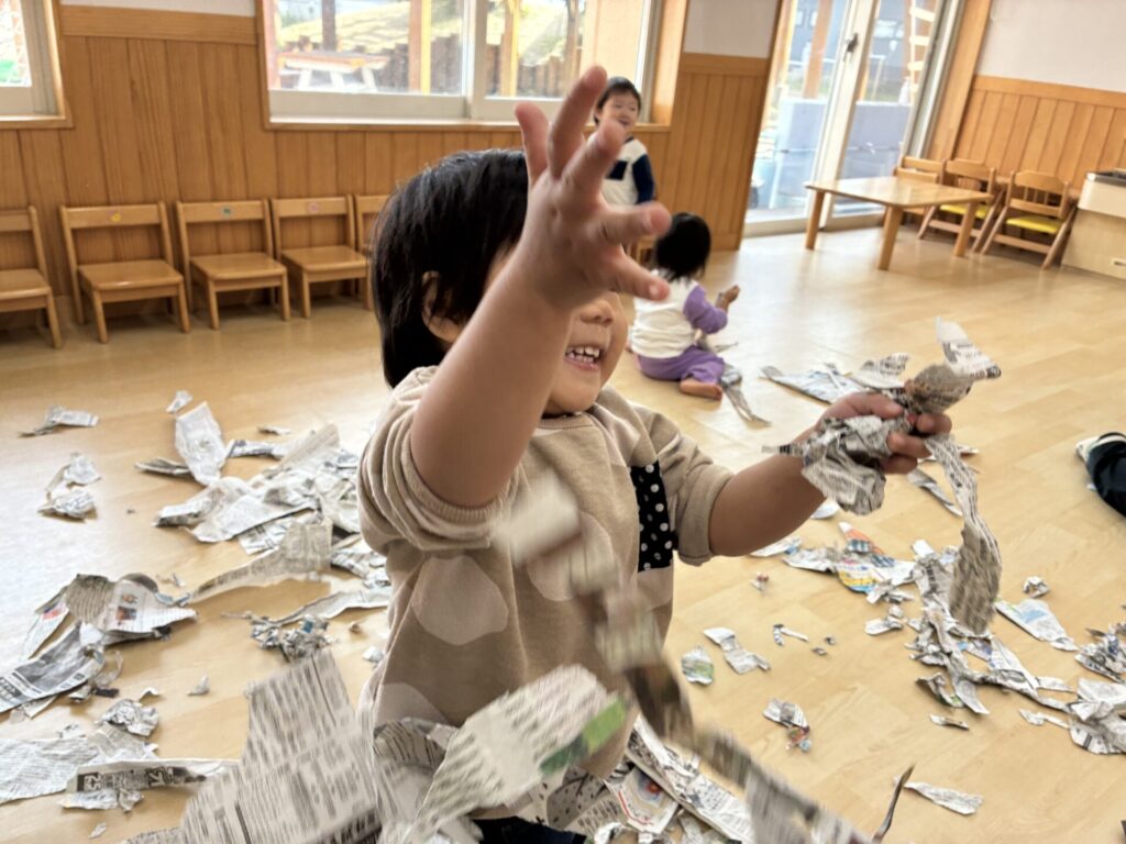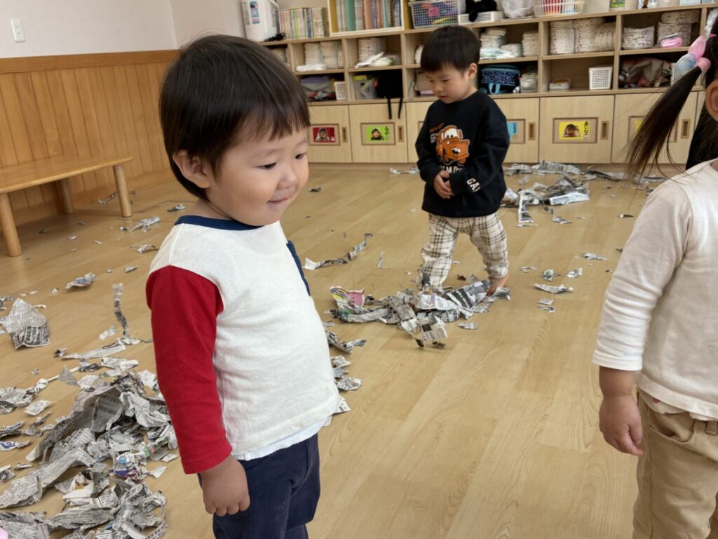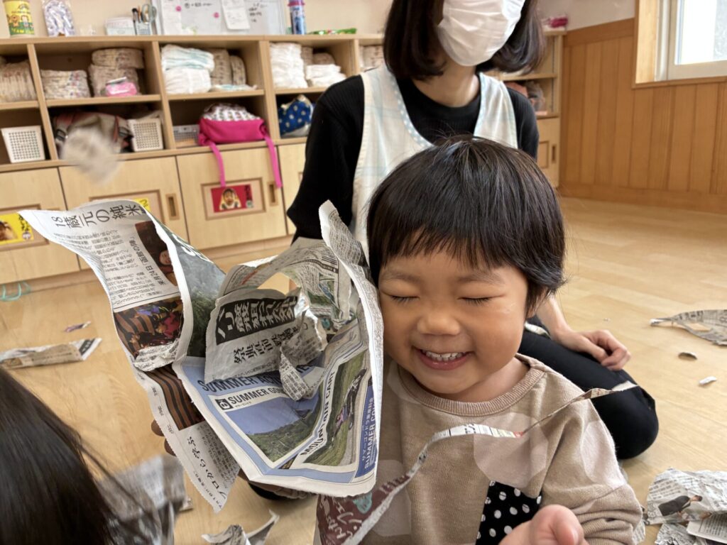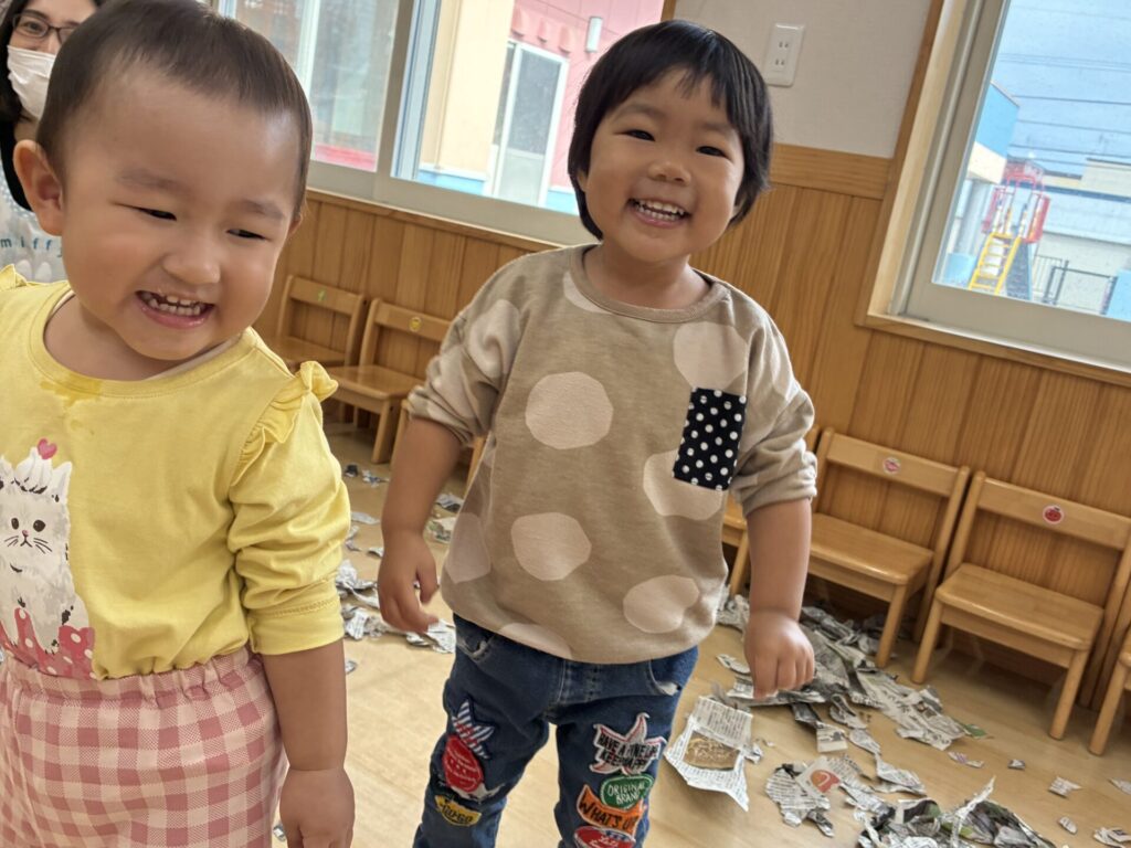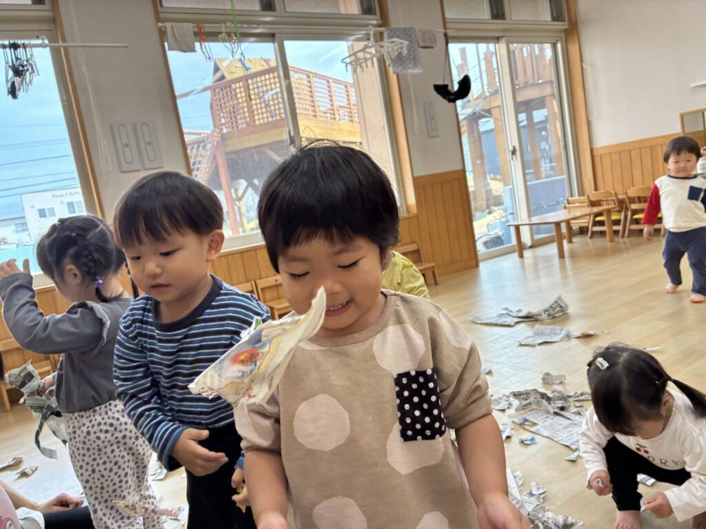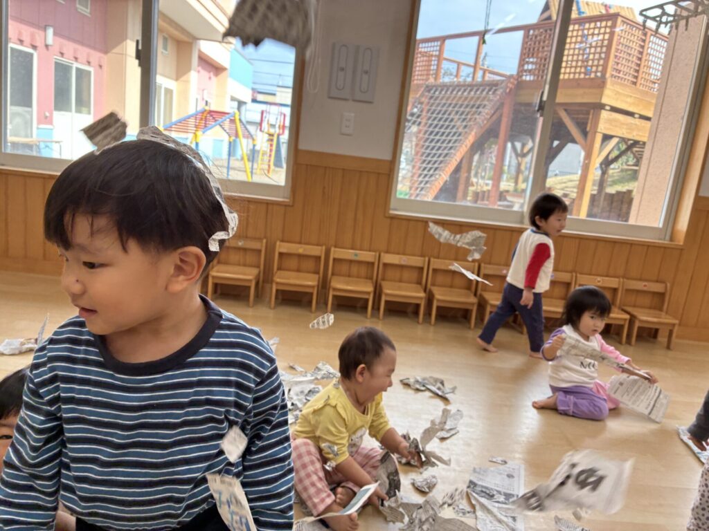 その後はお部屋で新聞遊びをしましたよ😊上から新聞を降らせると「きゃー!!」と大きな声を出して喜んでいてとても可愛らしかったです💕