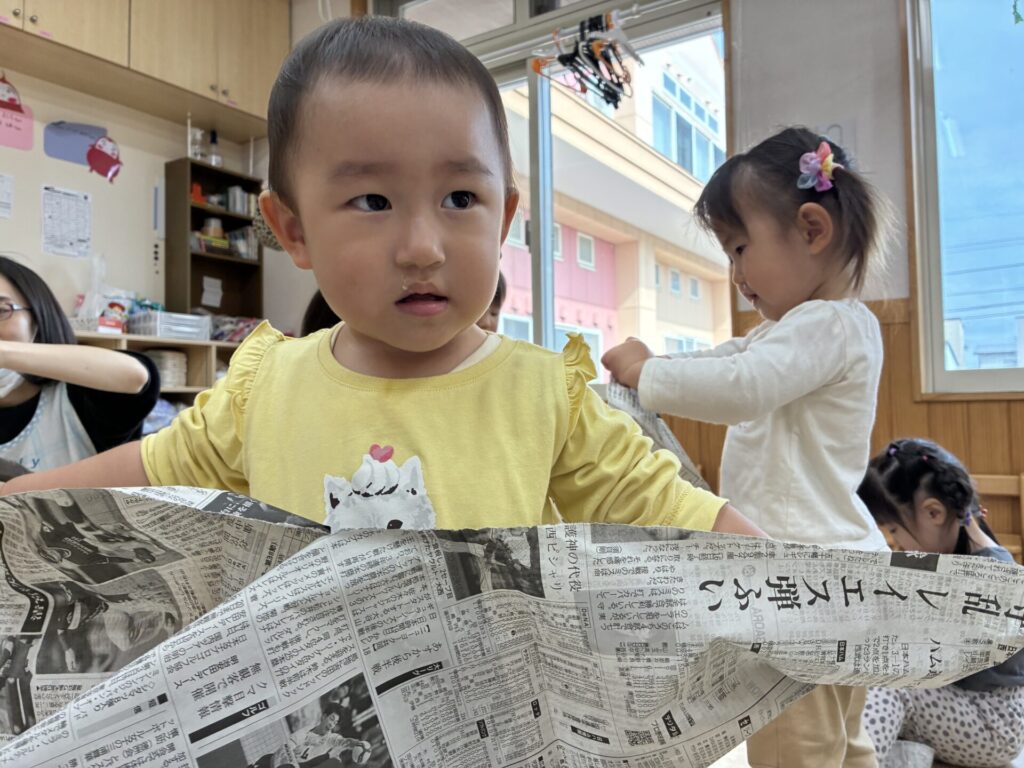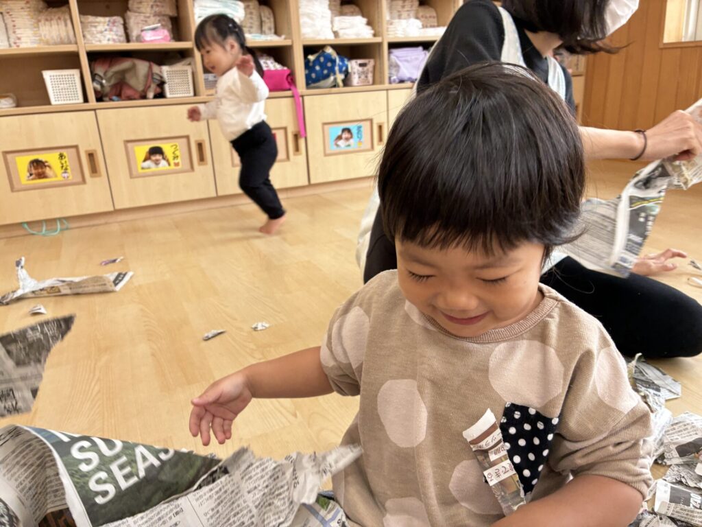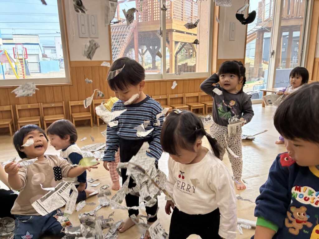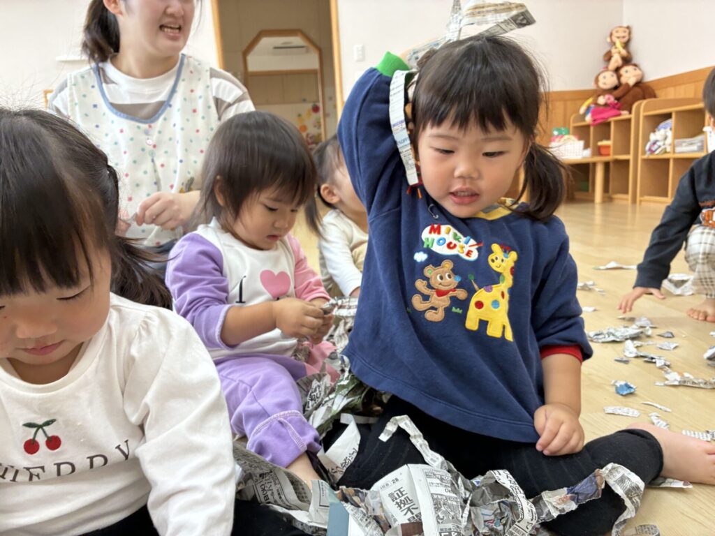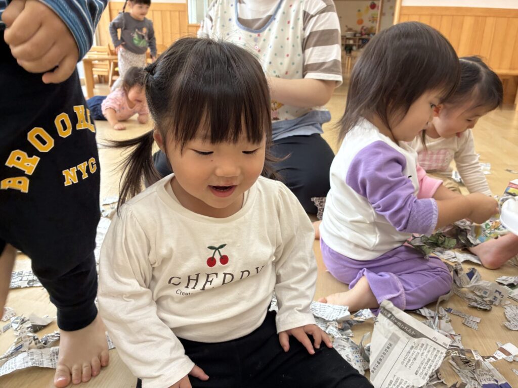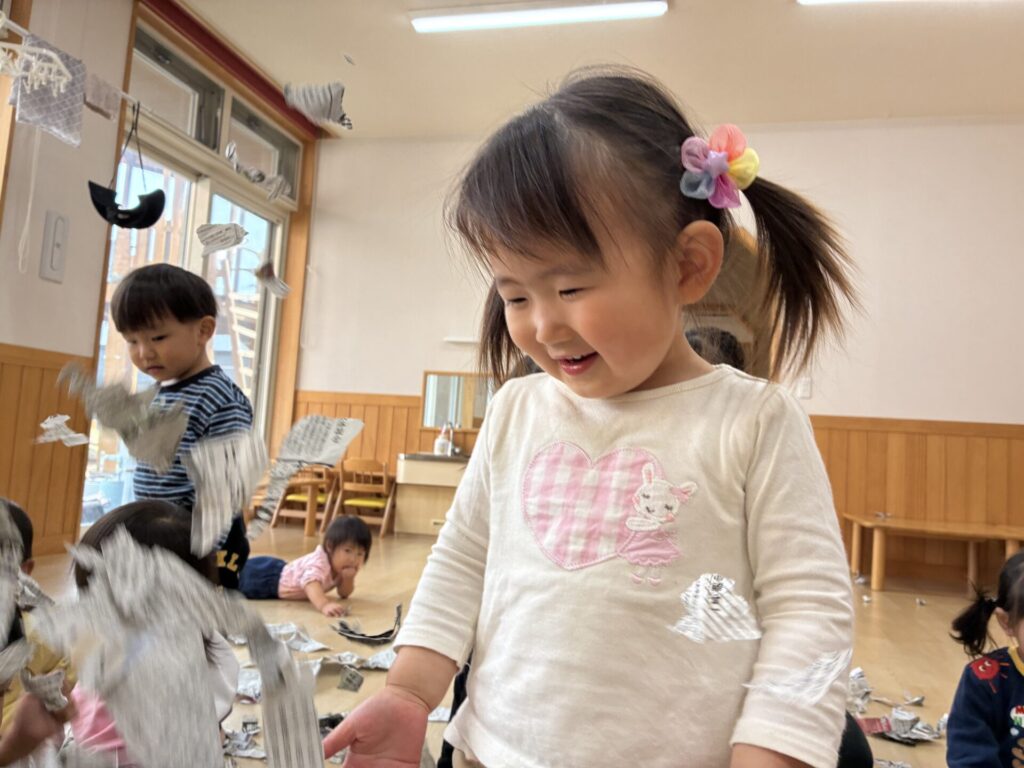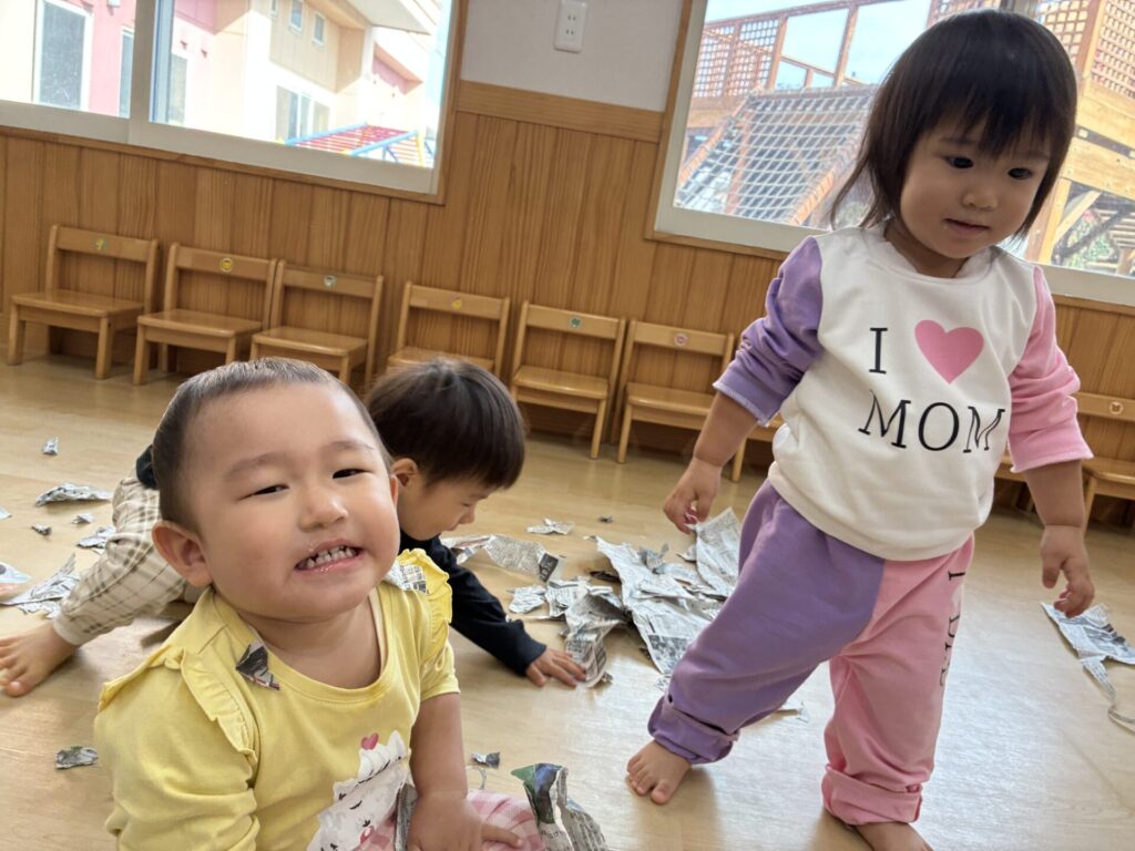 その後はお部屋で新聞遊びをしましたよ😊上から新聞を降らせると「きゃー!!」と大きな声を出して喜んでいてとても可愛らしかったです💕