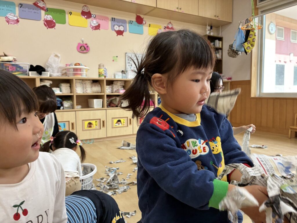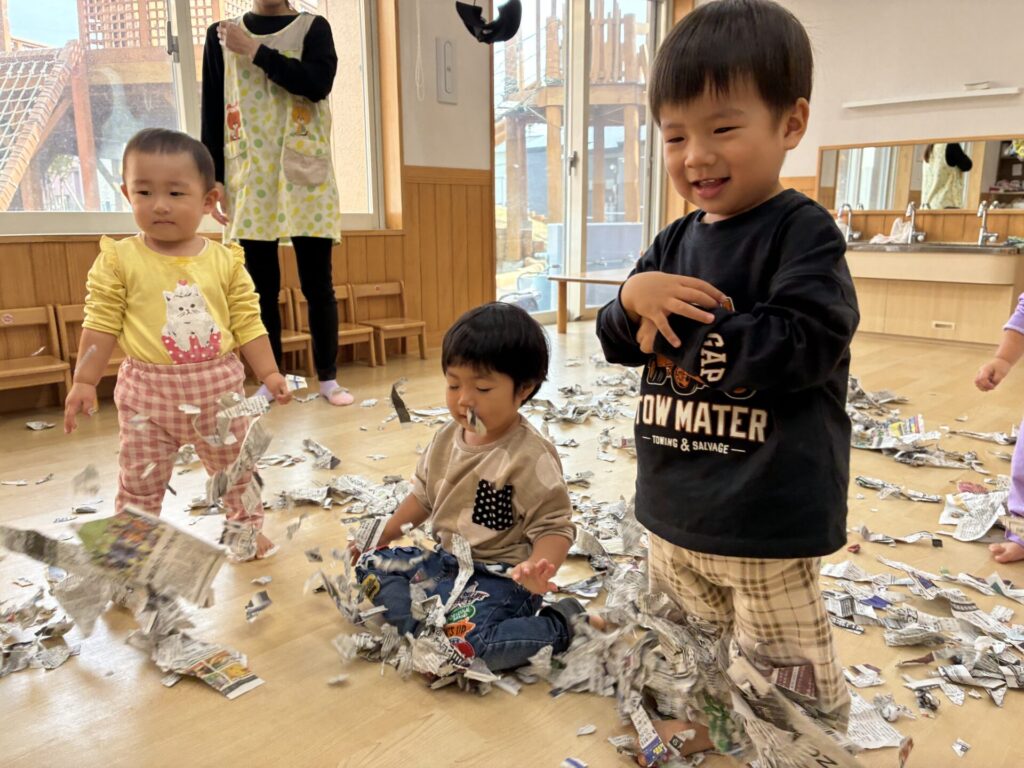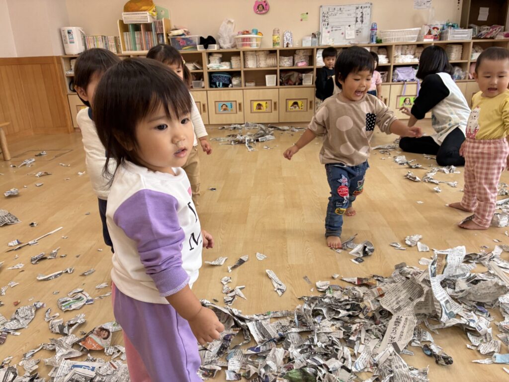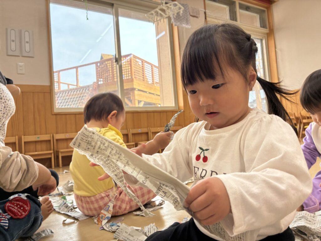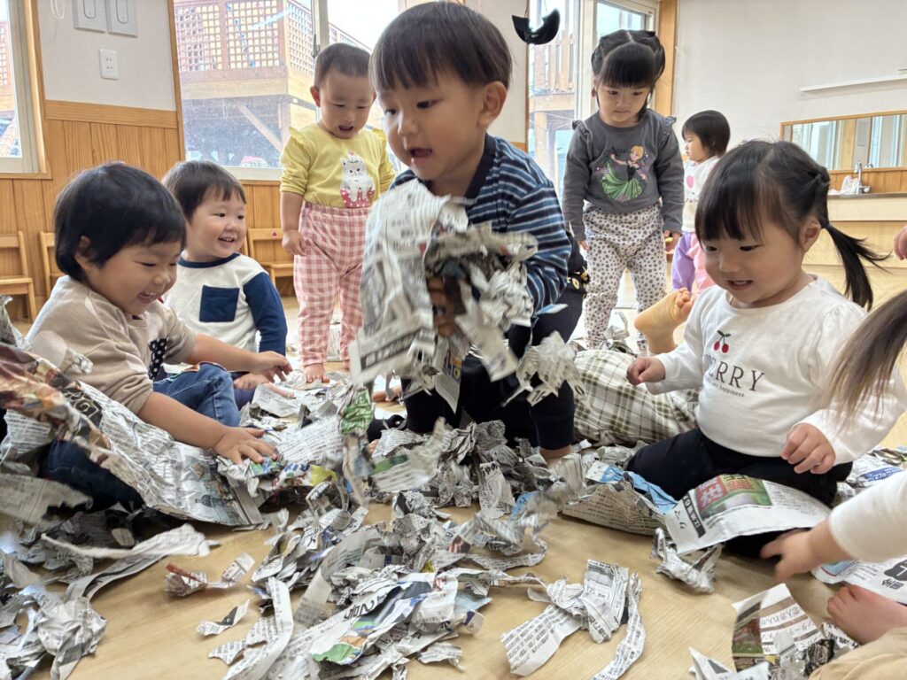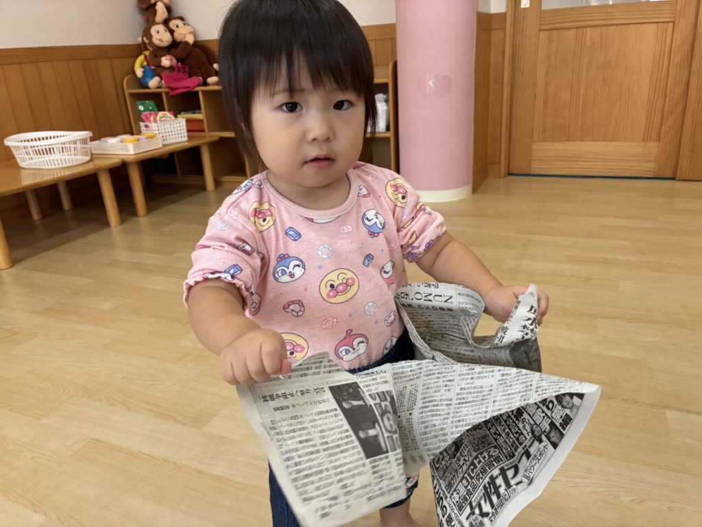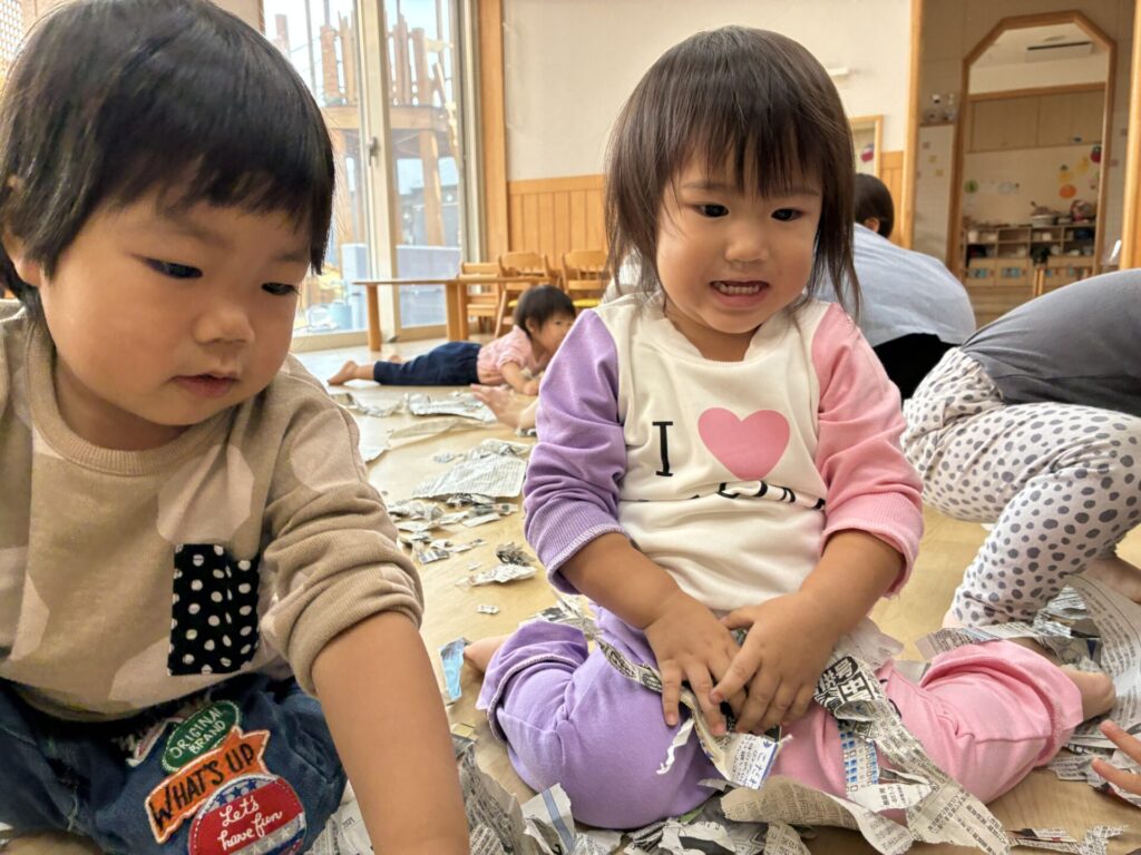 その後はお部屋で新聞遊びをしましたよ😊上から新聞を降らせると「きゃー!!」と大きな声を出して喜んでいてとても可愛らしかったです💕