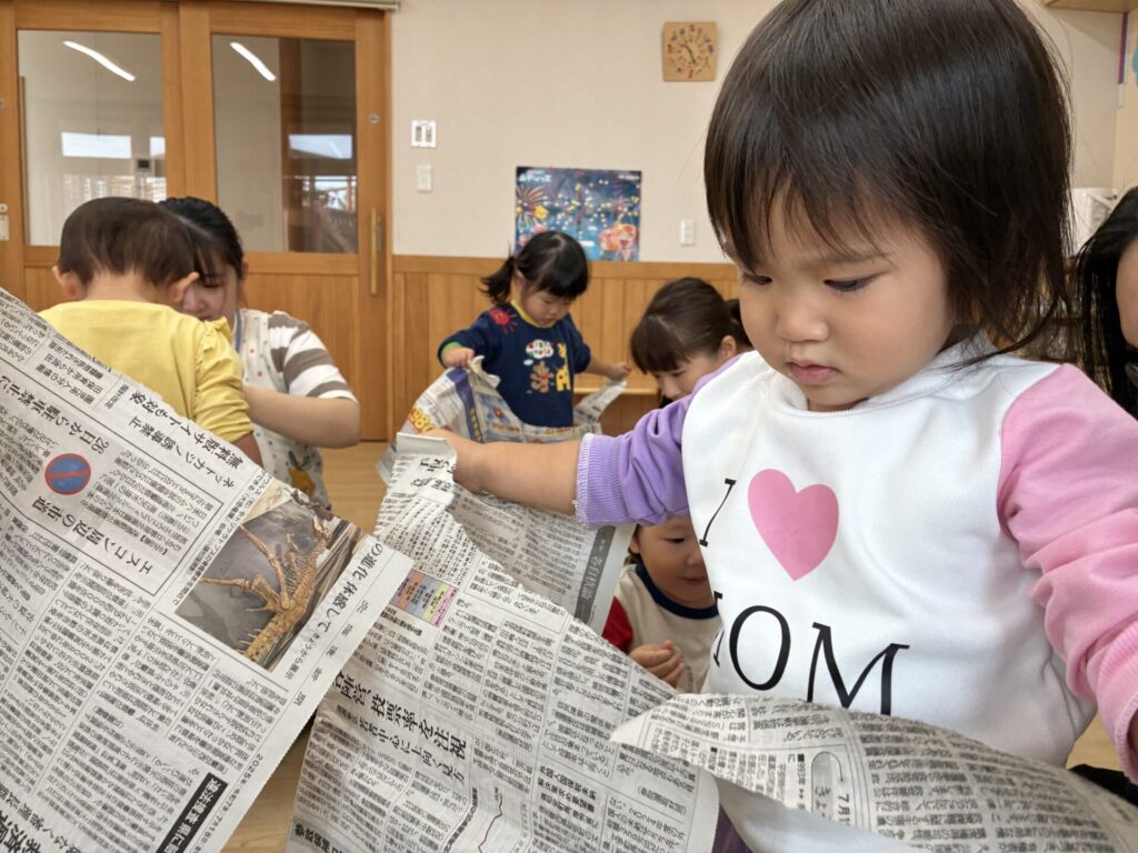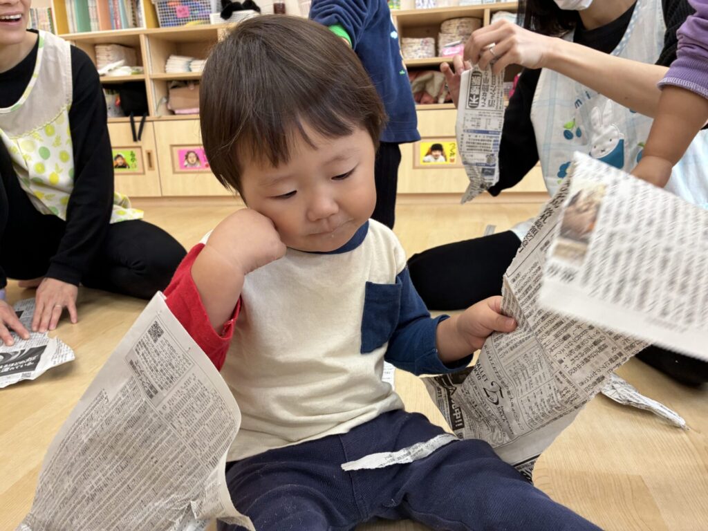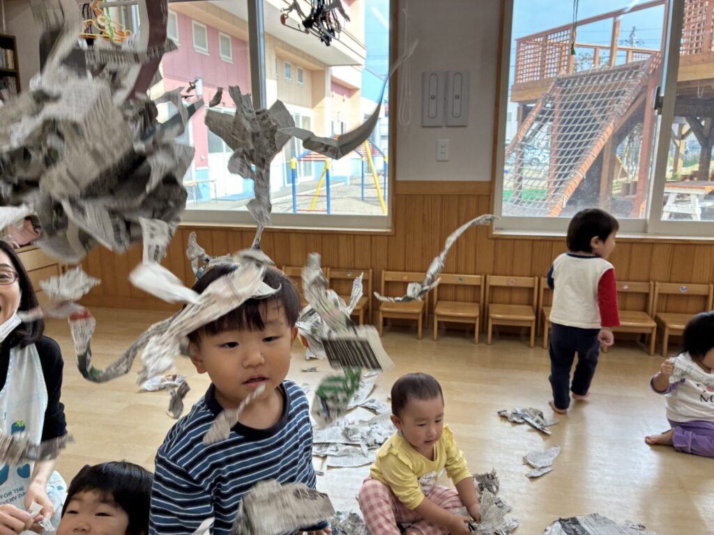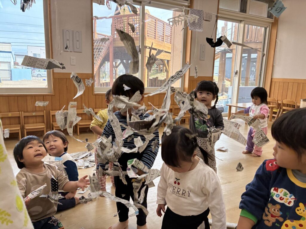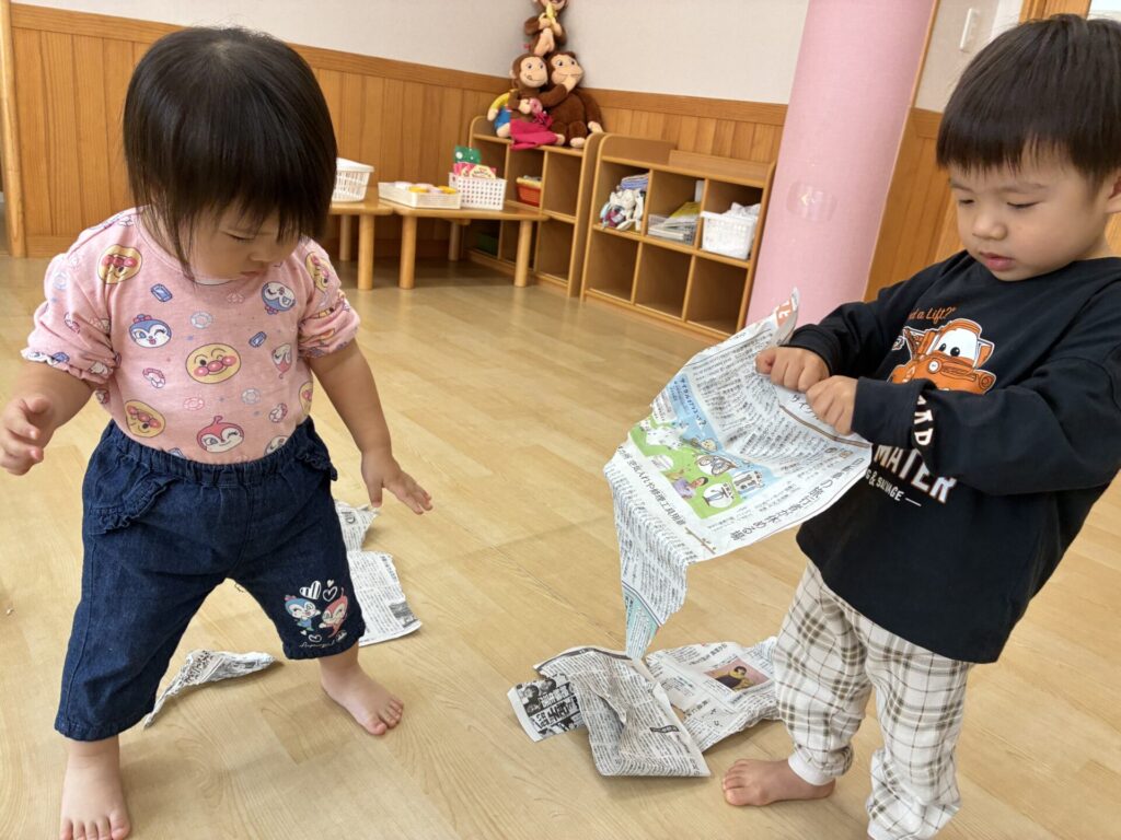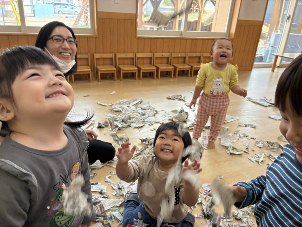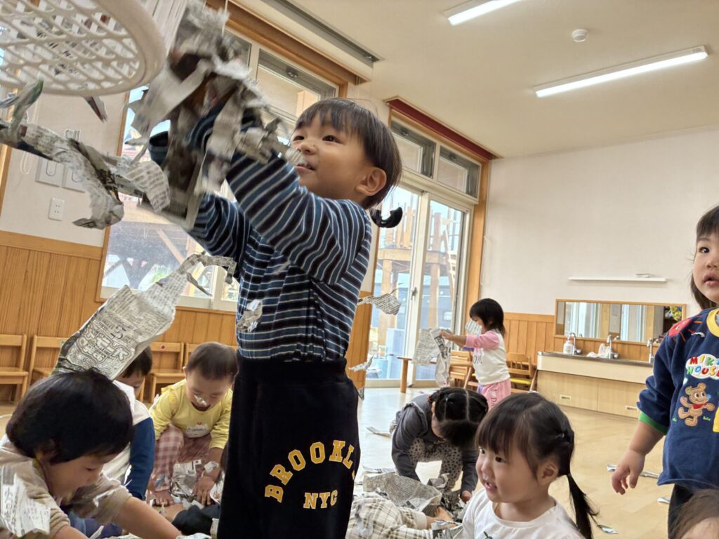 その後はお部屋で新聞遊びをしましたよ😊上から新聞を降らせると「きゃー!!」と大きな声を出して喜んでいてとても可愛らしかったです💕