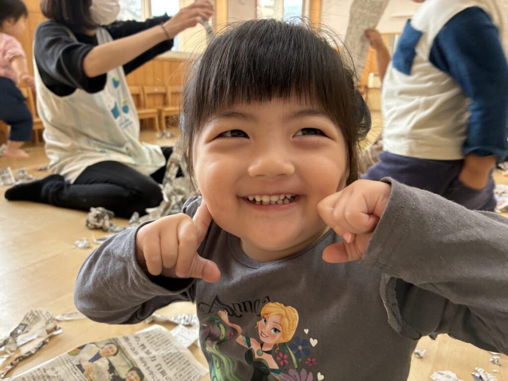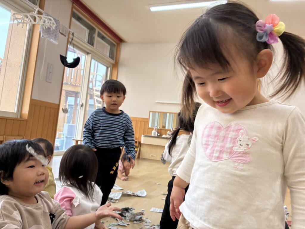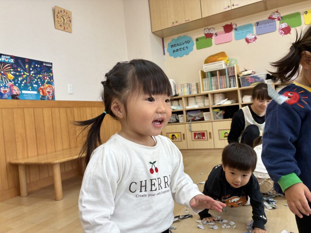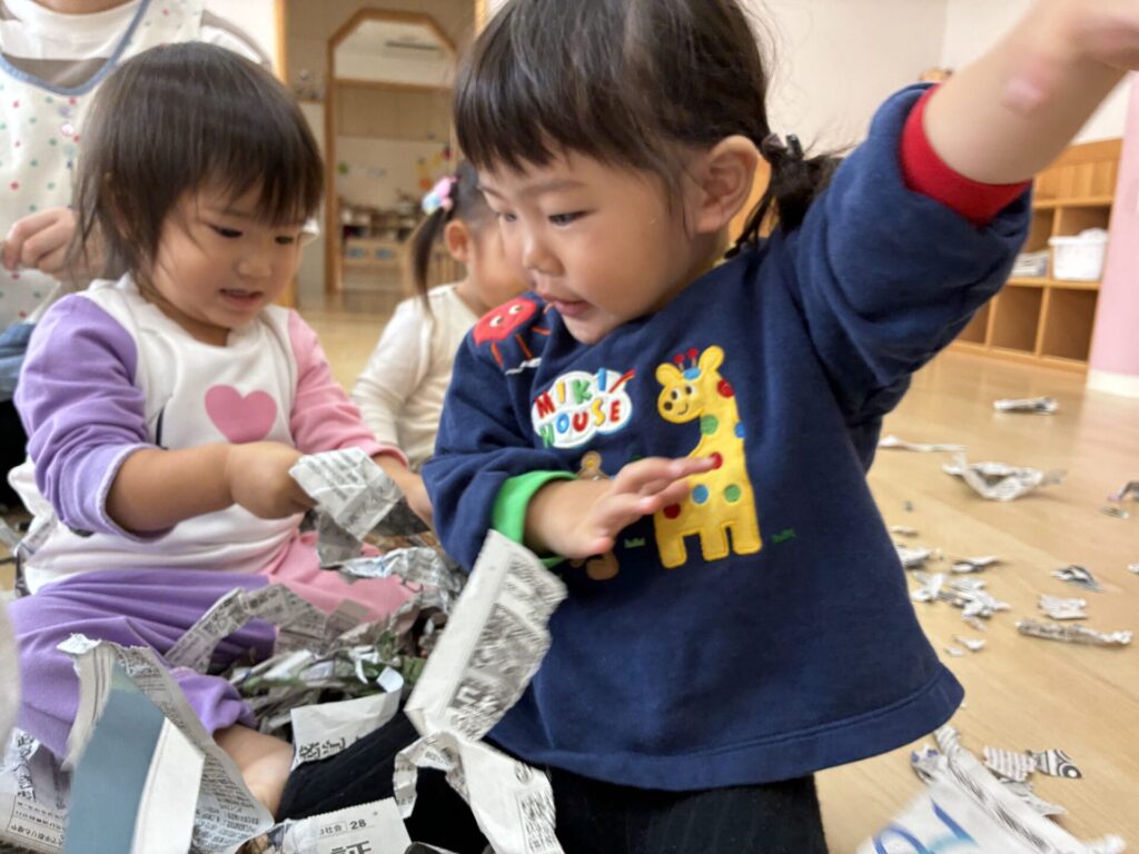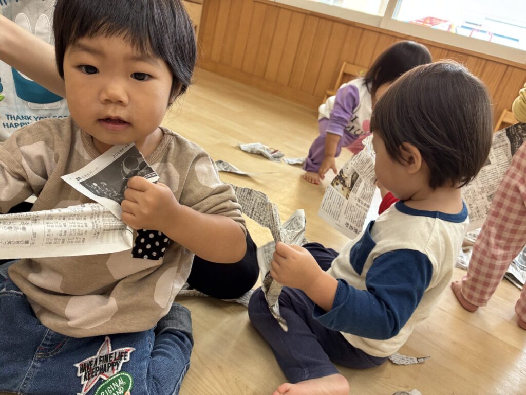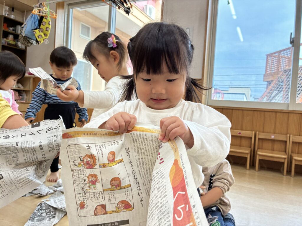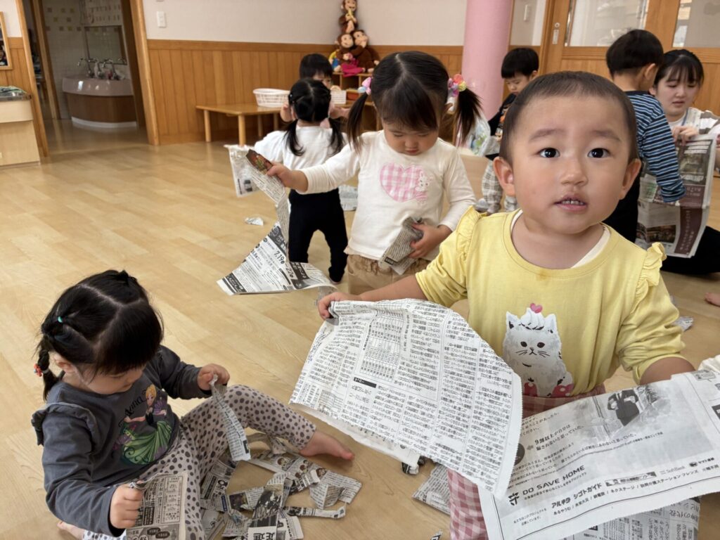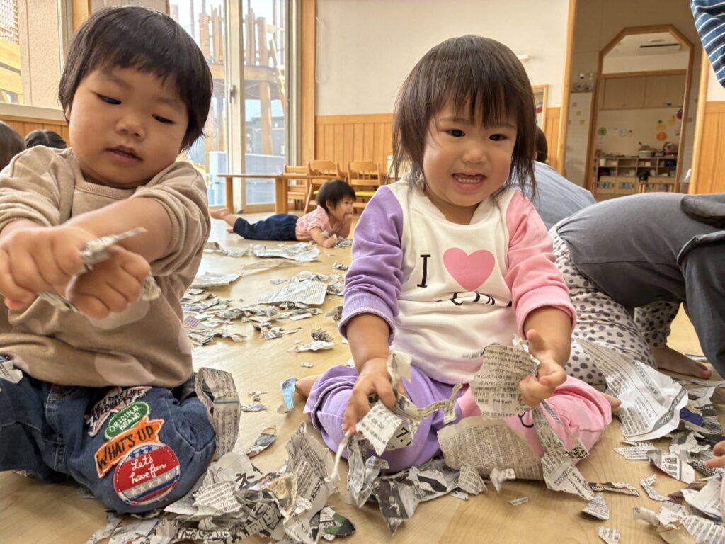 その後はお部屋で新聞遊びをしましたよ😊上から新聞を降らせると「きゃー!!」と大きな声を出して喜んでいてとても可愛らしかったです💕