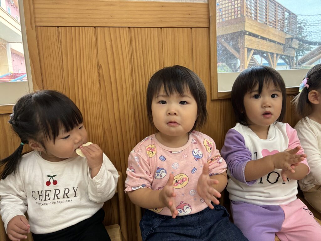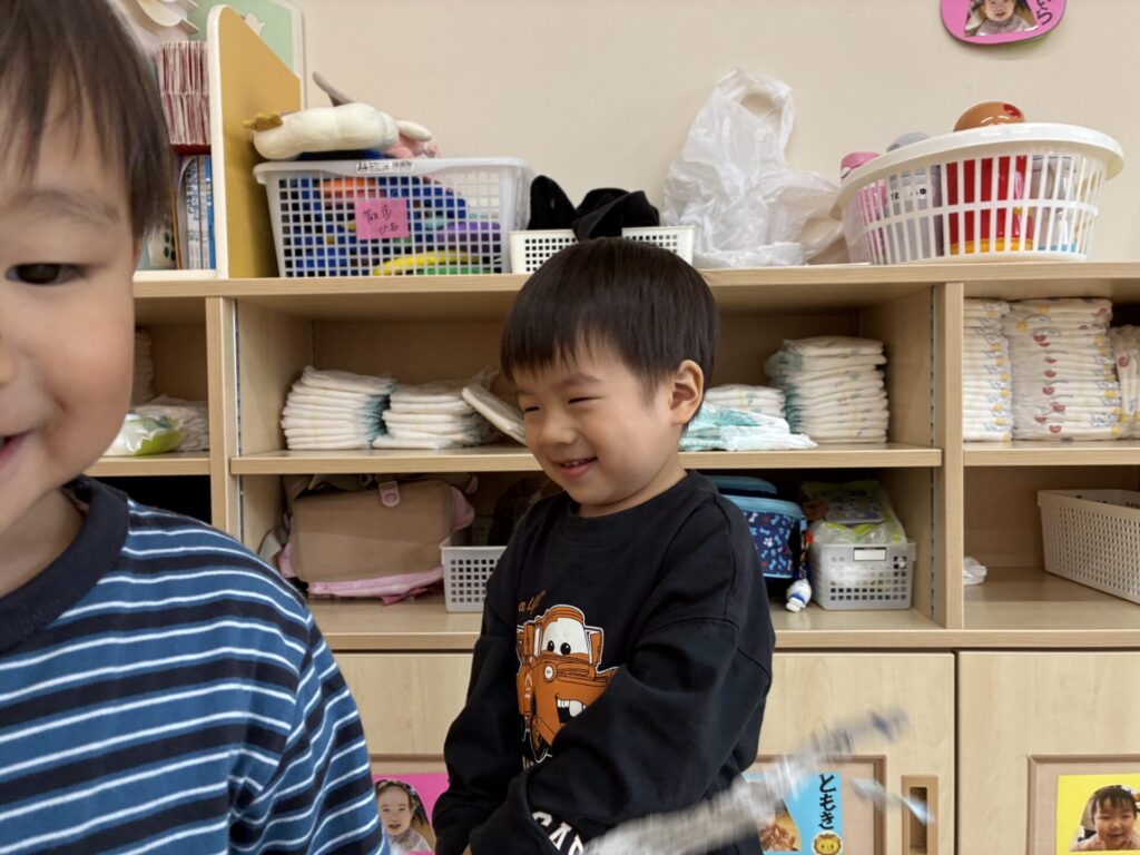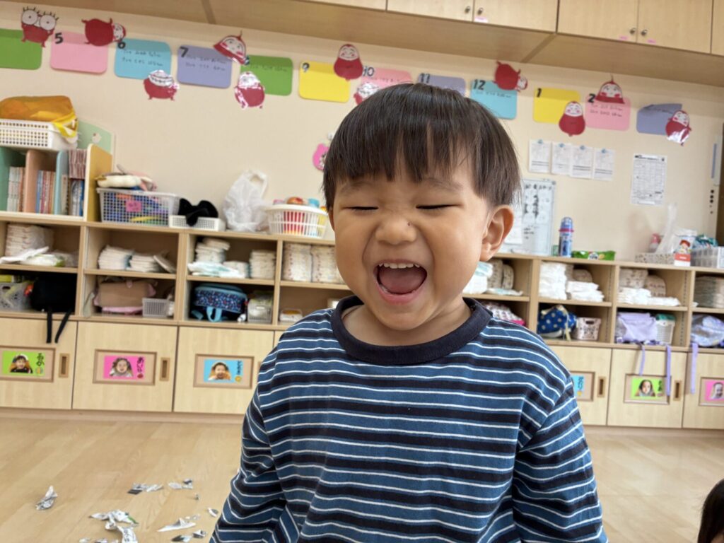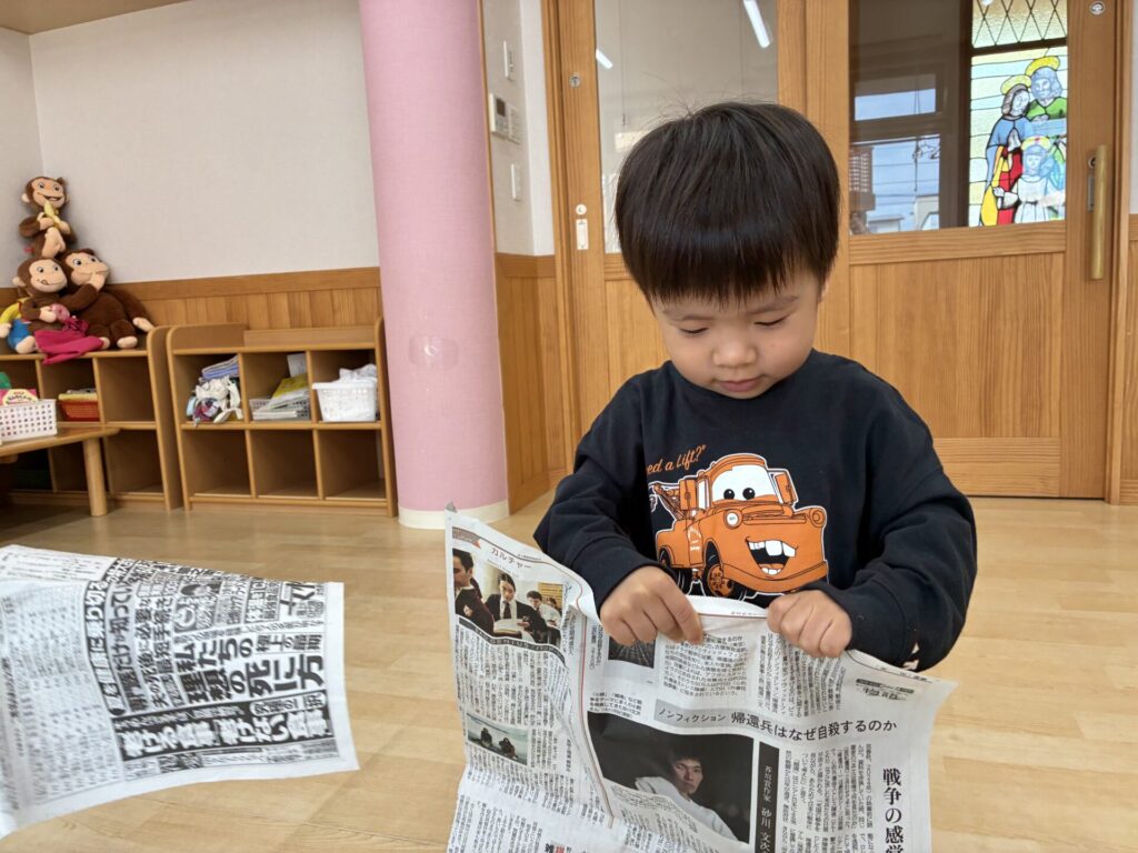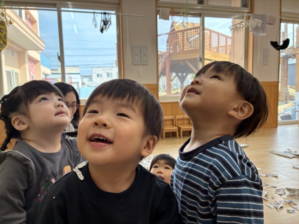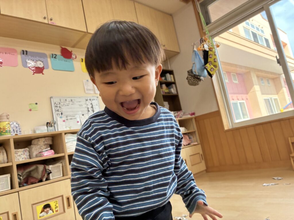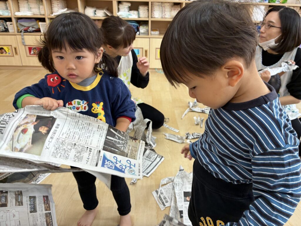 その後はお部屋で新聞遊びをしましたよ😊上から新聞を降らせると「きゃー!!」と大きな声を出して喜んでいてとても可愛らしかったです💕