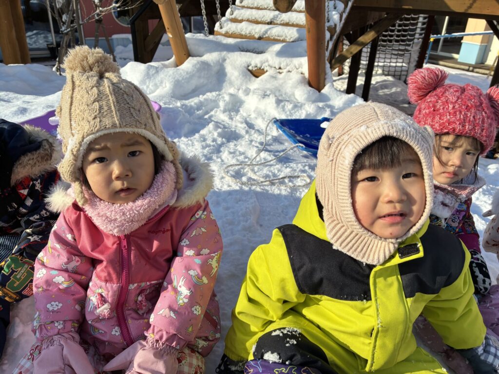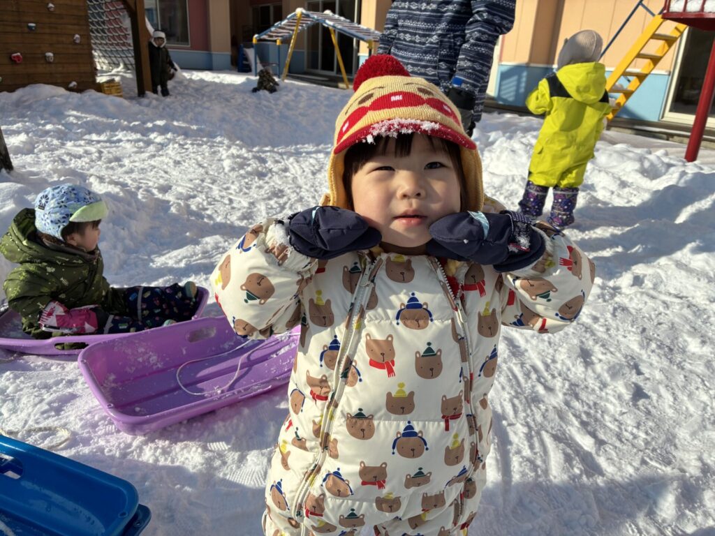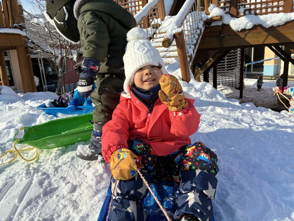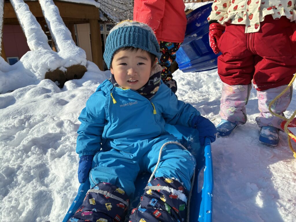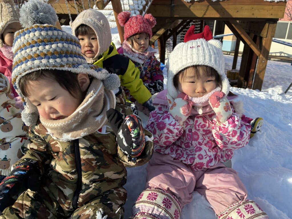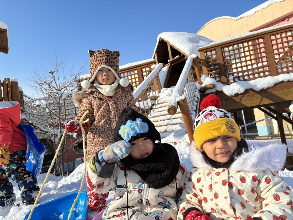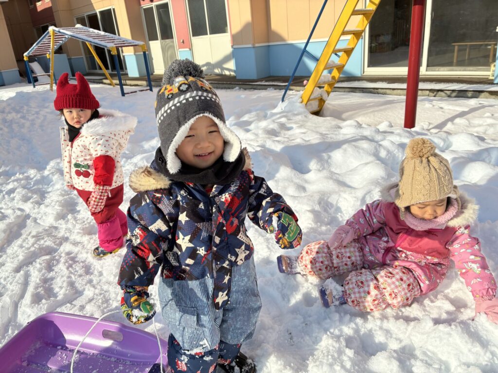 クリームちゃんは天気が良かったので雪遊びをしましたよ😊ちょっぴり泣いてしまう子もいましたがお友だちと仲良く遊ぶ姿が沢山見られました💕ソリ滑りやおしり滑りが上手になりました!!