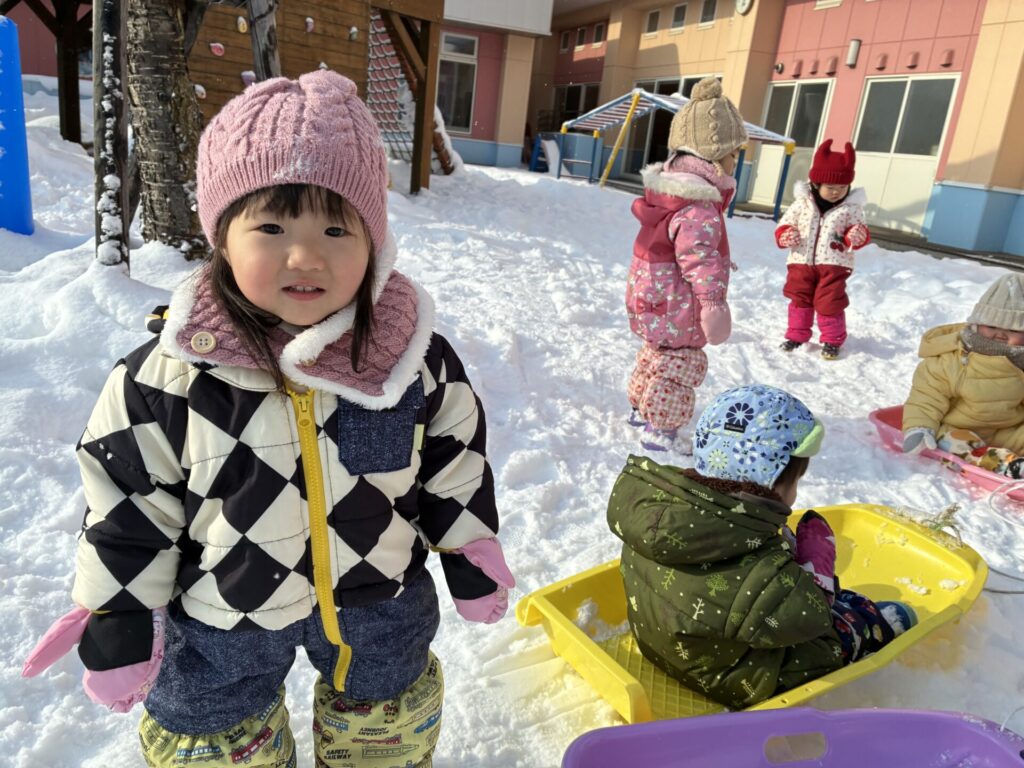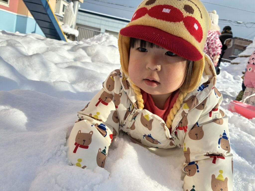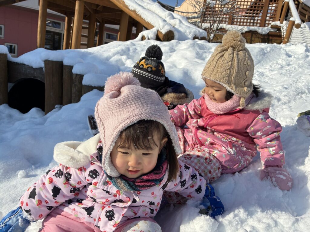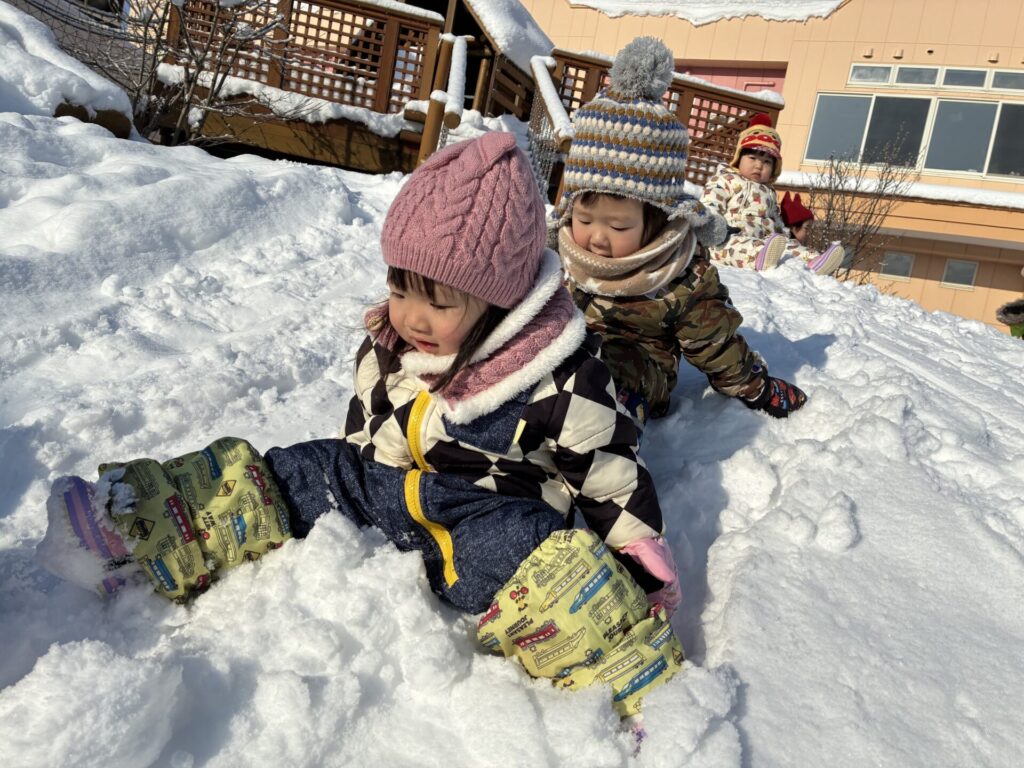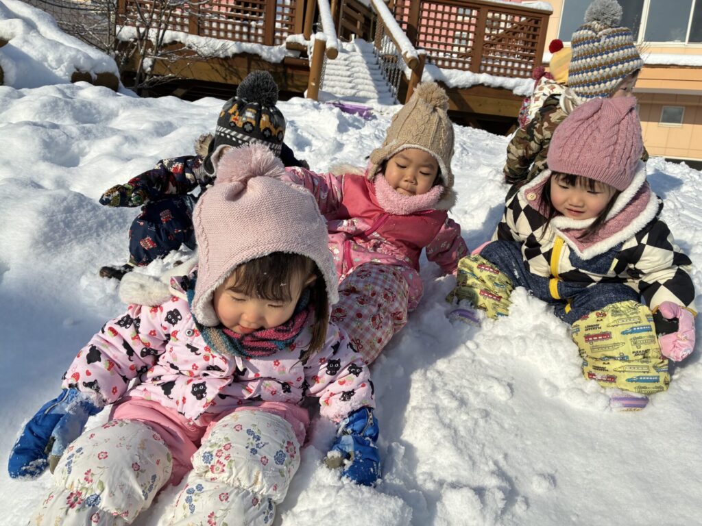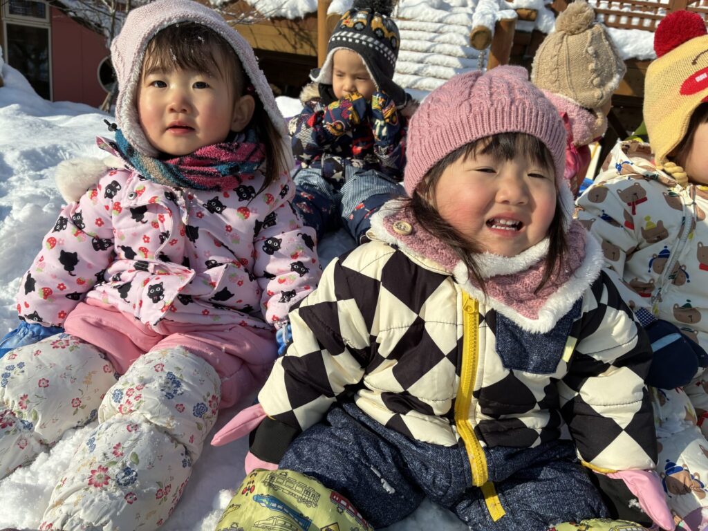 クリームちゃんは天気が良かったので雪遊びをしましたよ😊ちょっぴり泣いてしまう子もいましたがお友だちと仲良く遊ぶ姿が沢山見られました💕ソリ滑りやおしり滑りが上手になりました!!