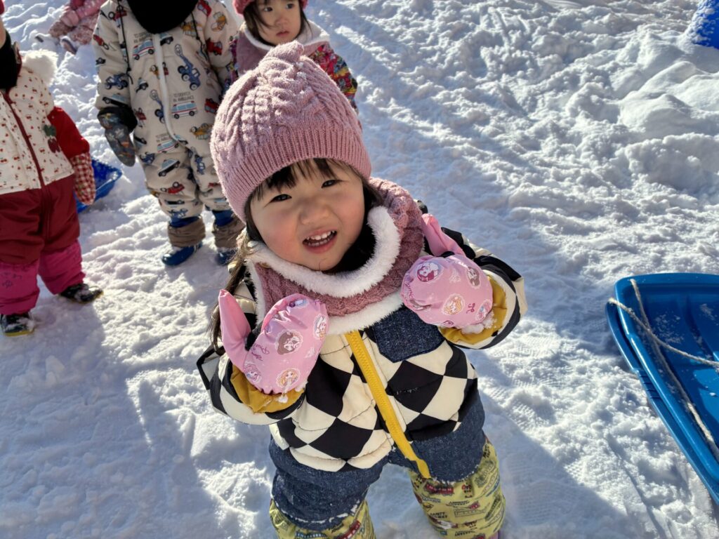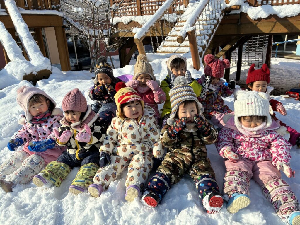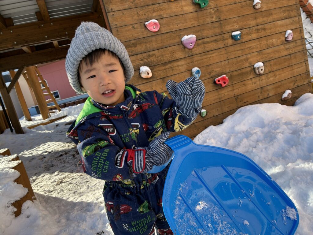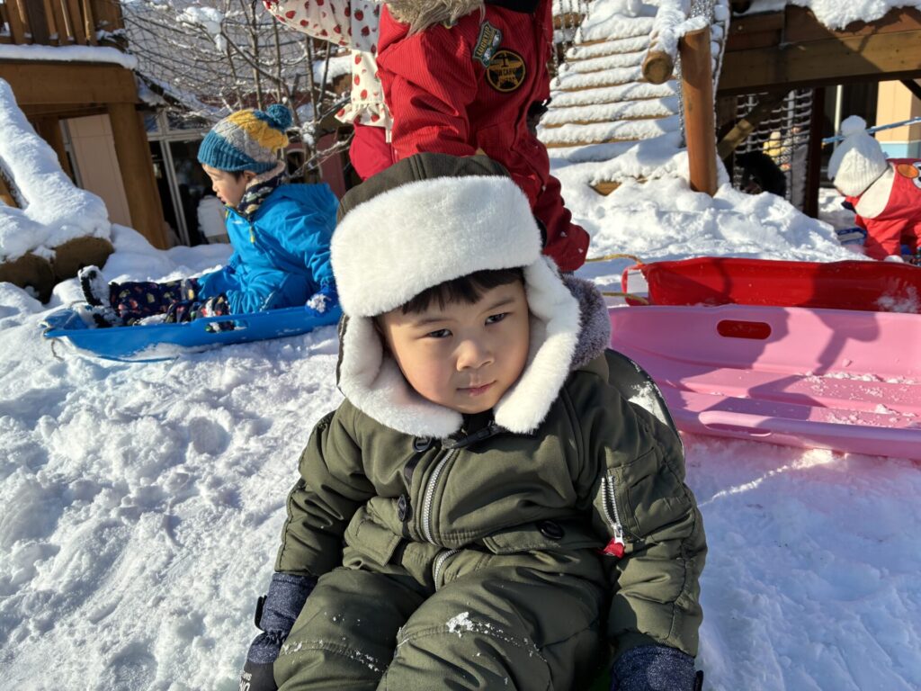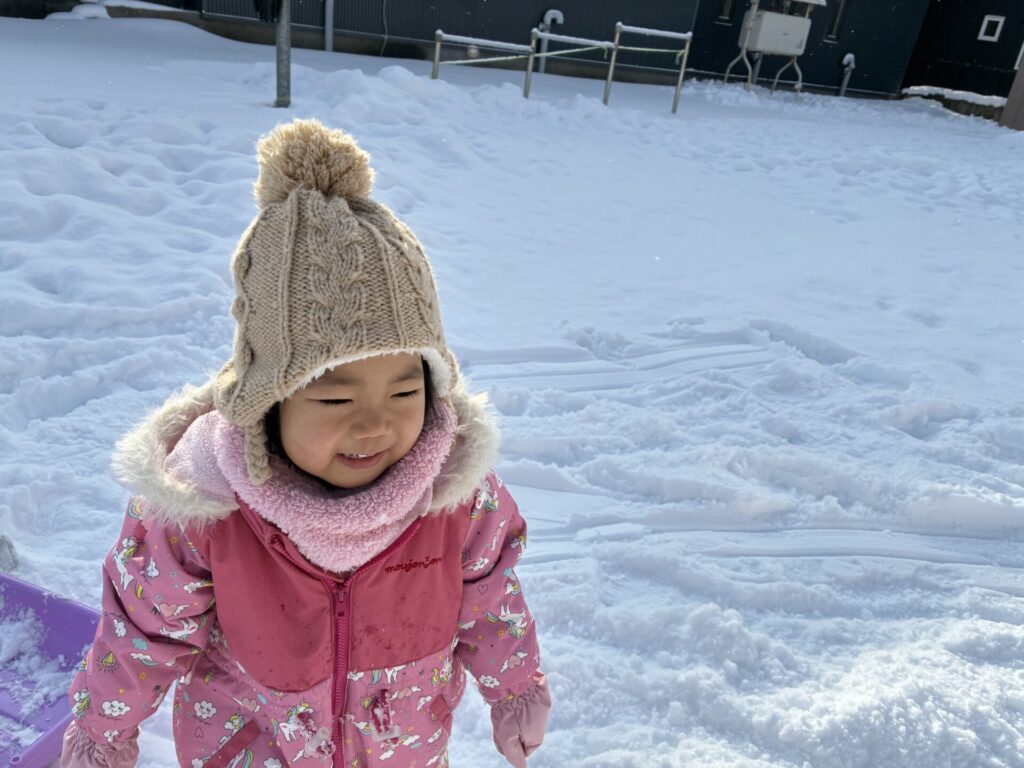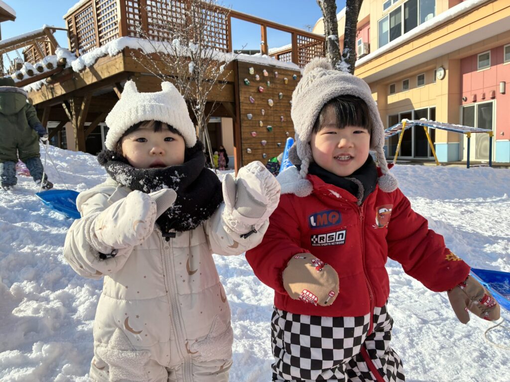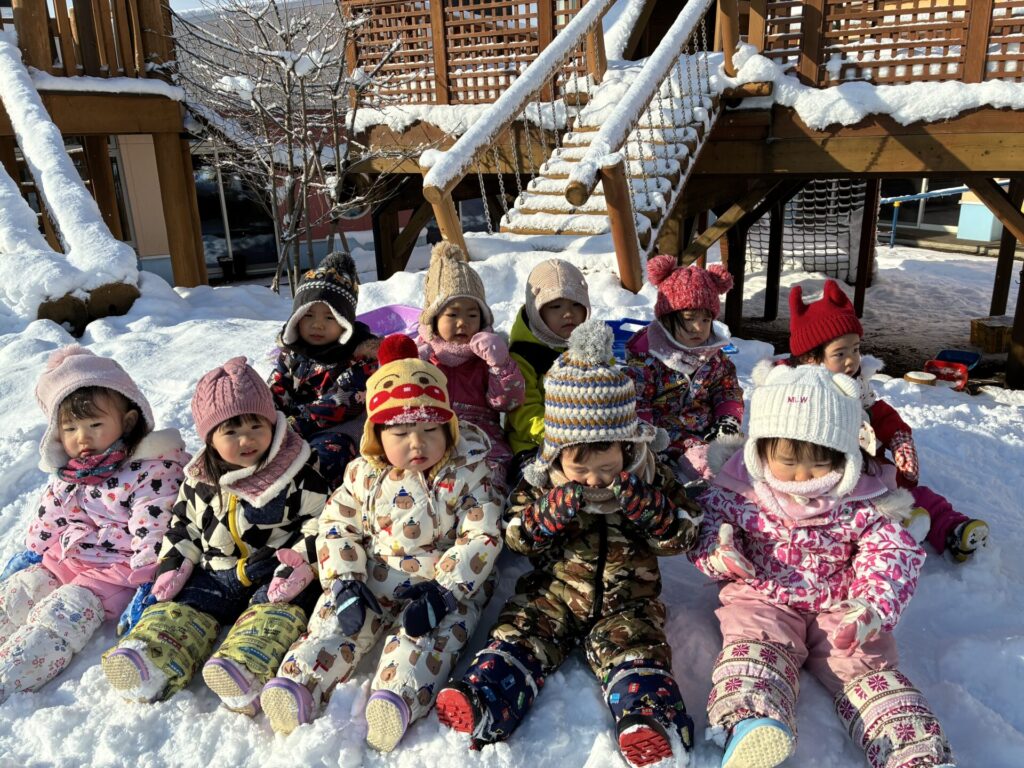 クリームちゃんは天気が良かったので雪遊びをしましたよ😊ちょっぴり泣いてしまう子もいましたがお友だちと仲良く遊ぶ姿が沢山見られました💕ソリ滑りやおしり滑りが上手になりました!!
