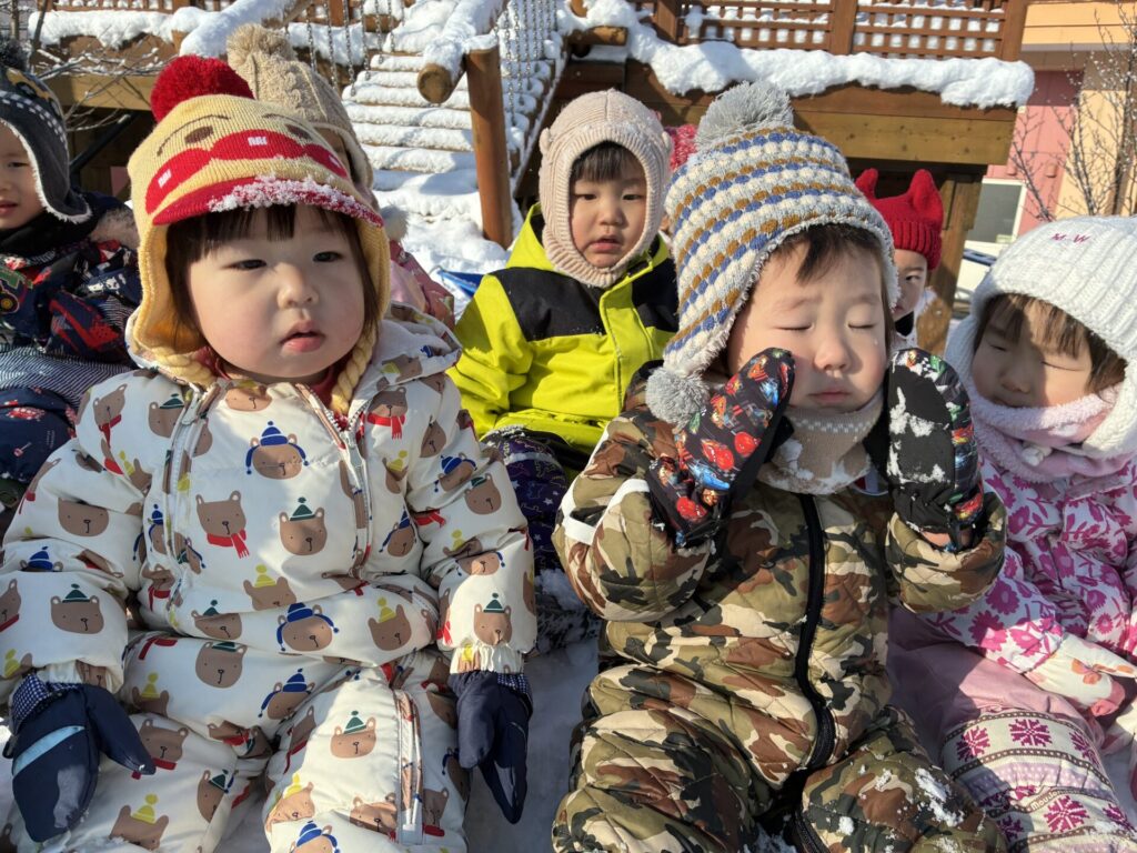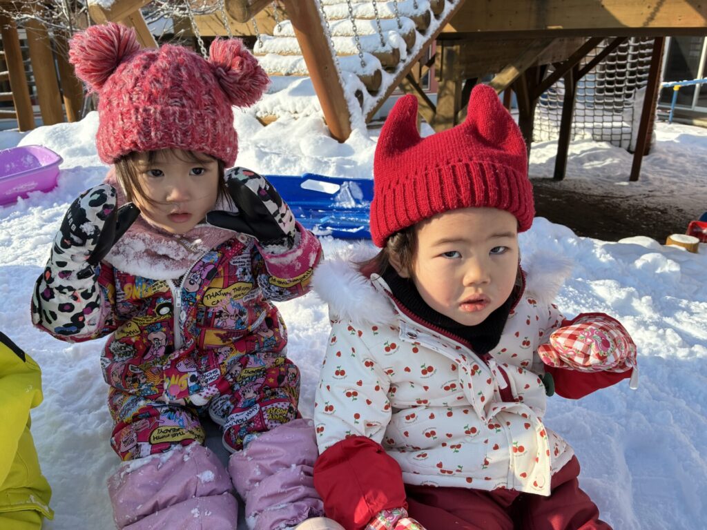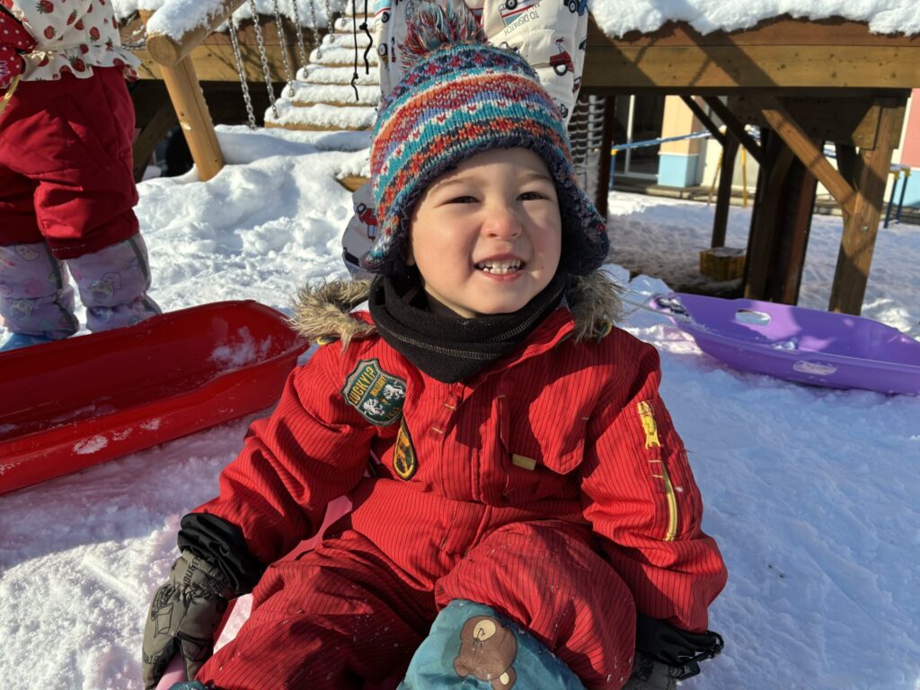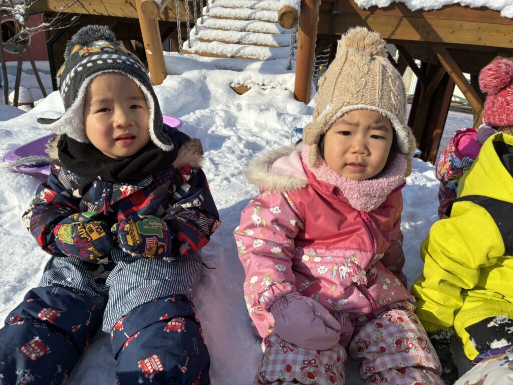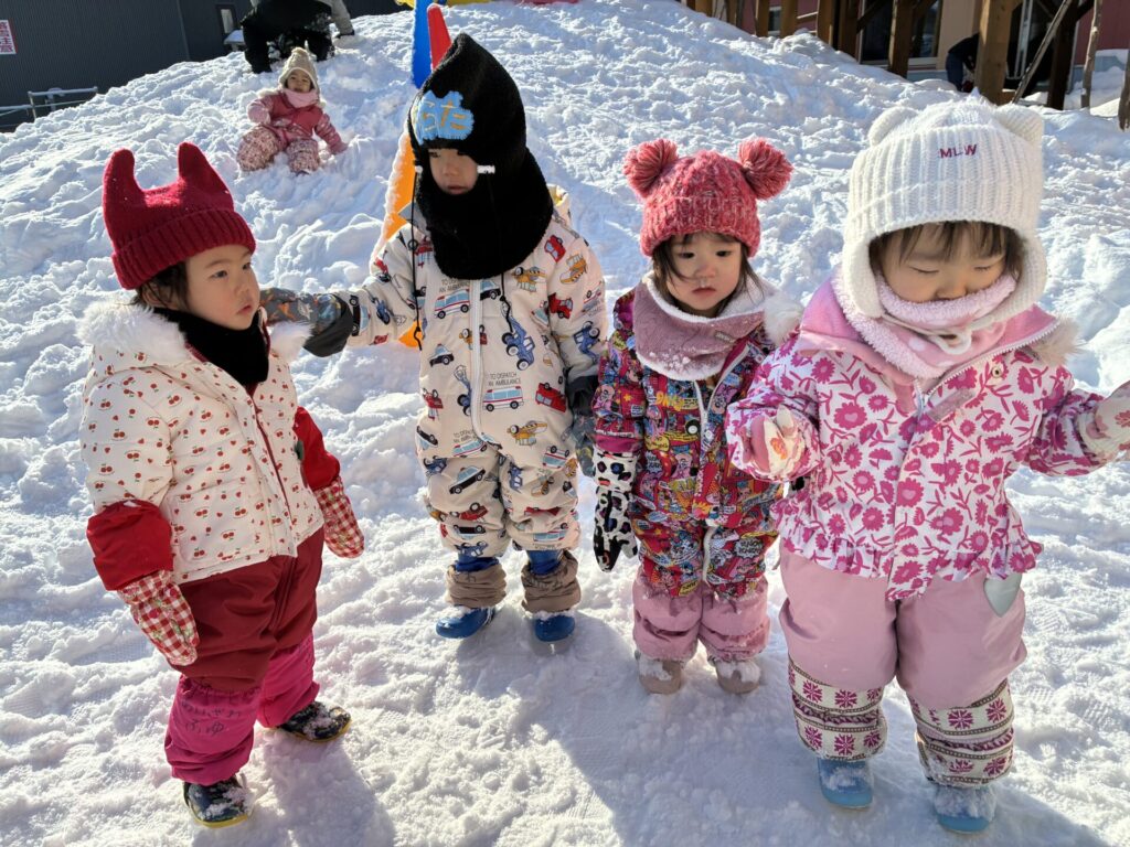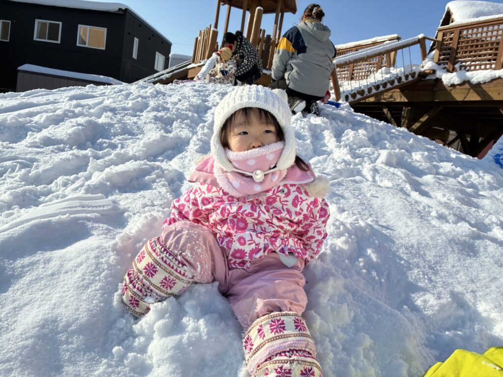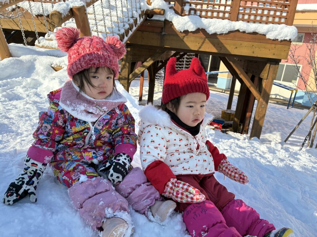 クリームちゃんは天気が良かったので雪遊びをしましたよ😊ちょっぴり泣いてしまう子もいましたがお友だちと仲良く遊ぶ姿が沢山見られました💕ソリ滑りやおしり滑りが上手になりました!!